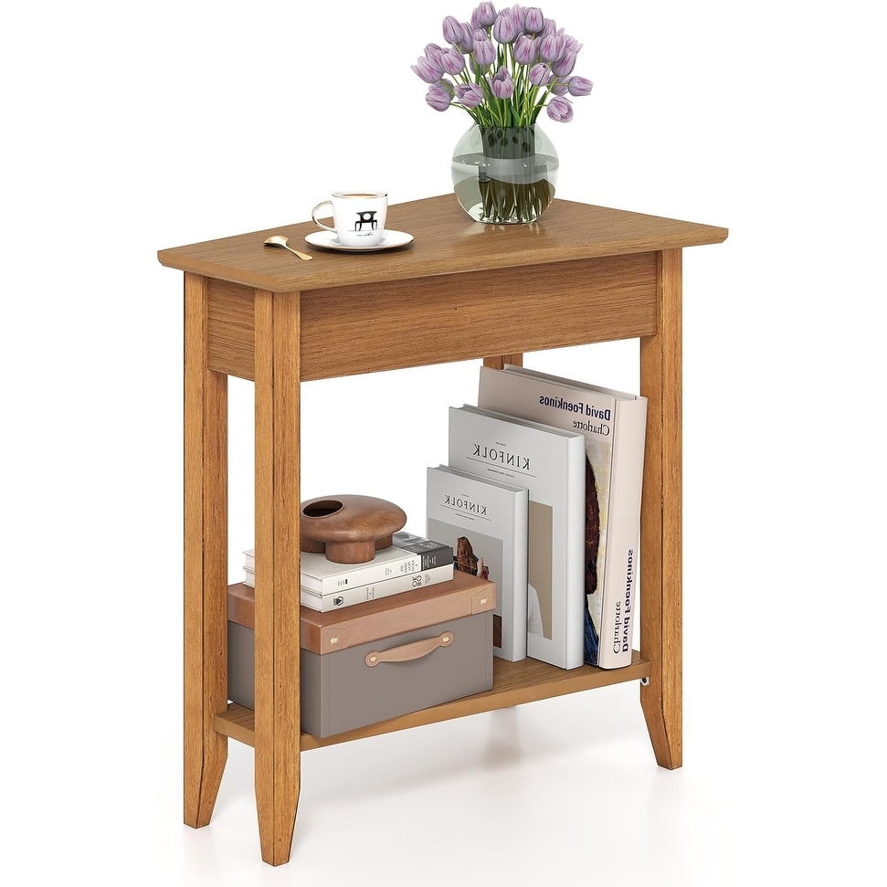 Narrow 2-Tier Wedge End Table with Storage, Solid Wood Legs, Triangle Side Table for Living Room, Bedroom, Small Spaces