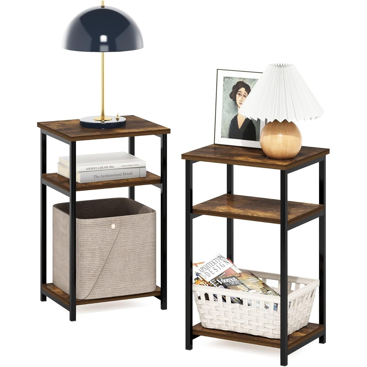 3-Tier Metal Frame End Table with Storage Shelves, 2-Pack, Amber Pine