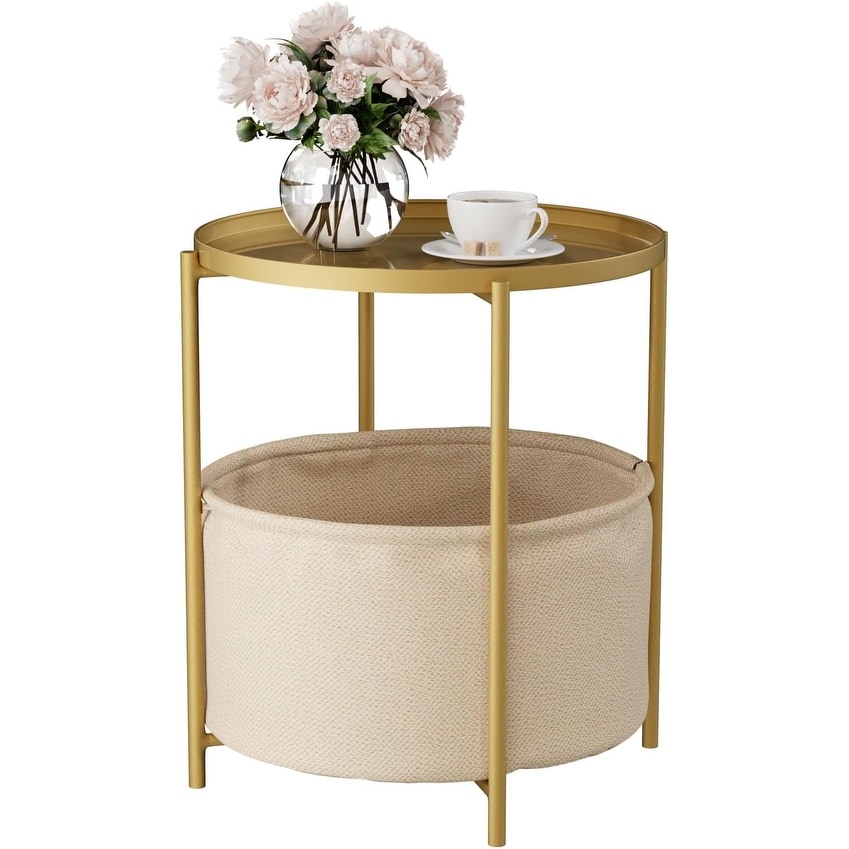 Modern 2-Tier Round Side Table with Fabric Basket and Removable Tray, Gold