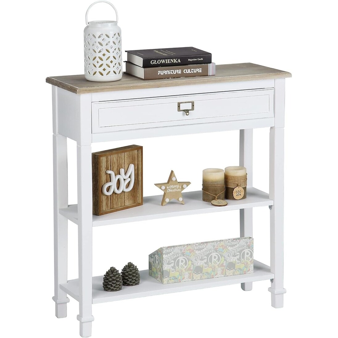 3-Tier Sofa Table with Drawers and Open Shelves, Wooden Top, Handcrafted Finish (White)