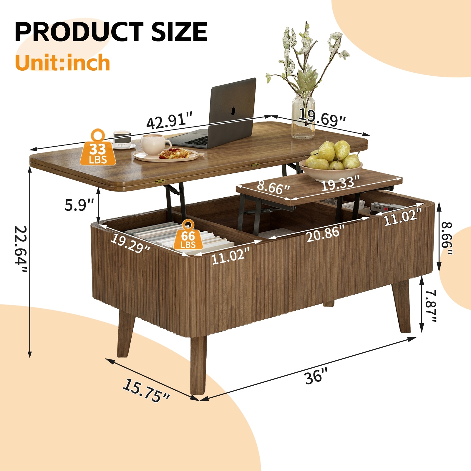 3 in 1 Lift Top Coffee Table Convertible Dining Table with Small Lift Top Tea Table, Hidden Storage, Fluted Wood Sofa Table