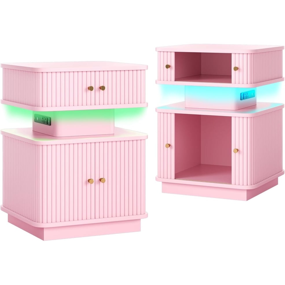 LED End Table with Charging Station, USB Ports, Sliding Door, Curvy Design for Living Room