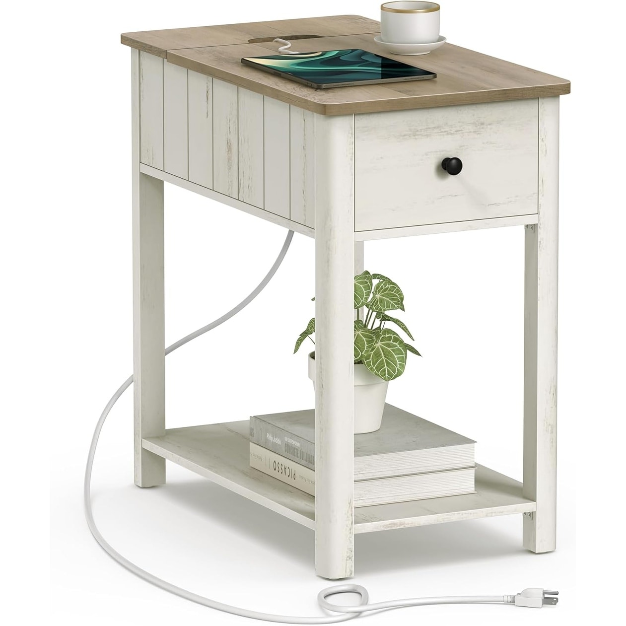 Side Table with Charging Station, USB Ports, Outlets, and Storage for Living Room or Bedroom, Modern Farmhouse Style