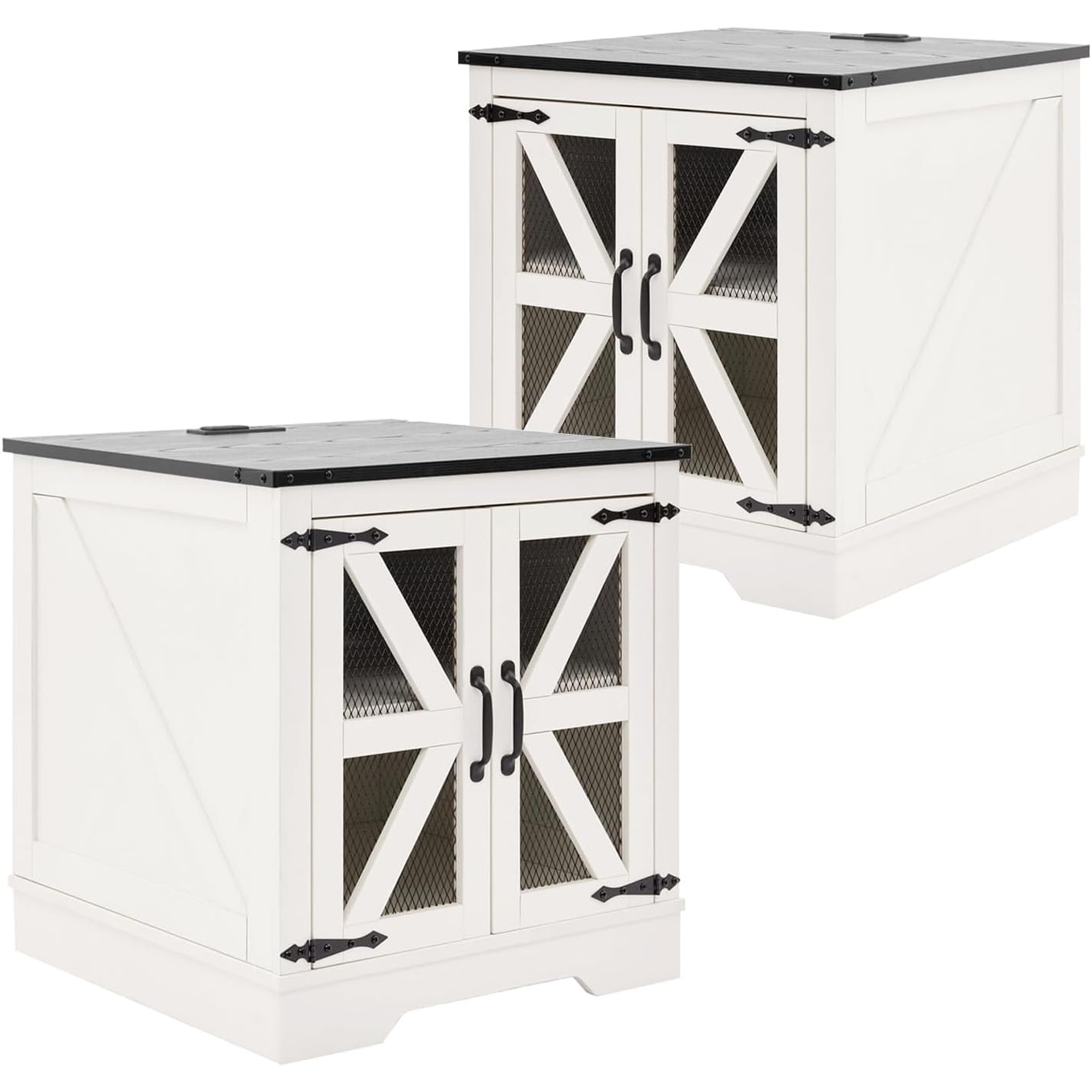 Farmhouse End Table Set of 2 with Charging Station and Mesh Door, Rustic Black Wood Nightstand for Living Room & Bedroom