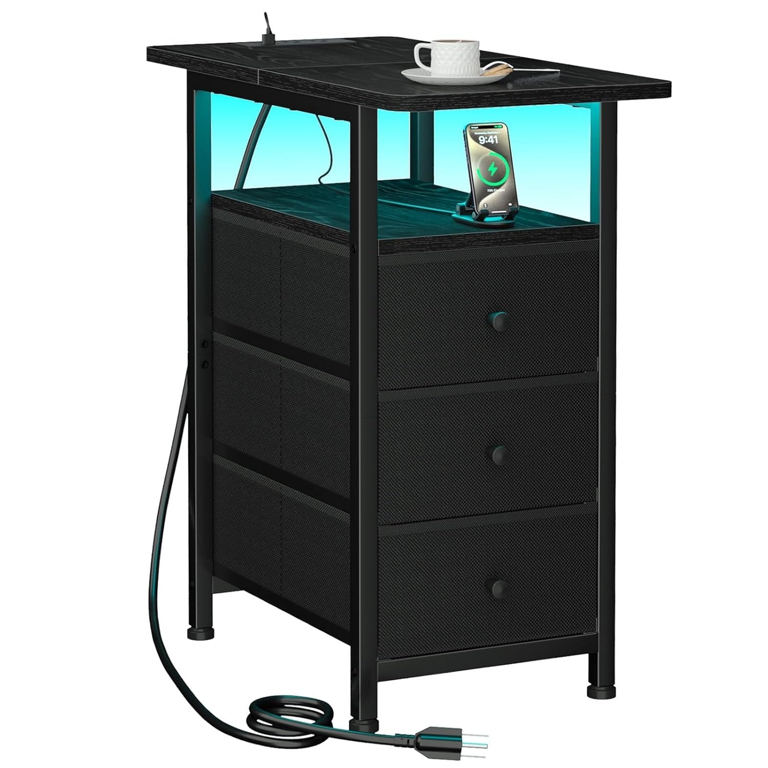 Slim Narrow End Table with Charging Station & LED Lights, Fabric Drawer Nightstand for Small Spaces - Black