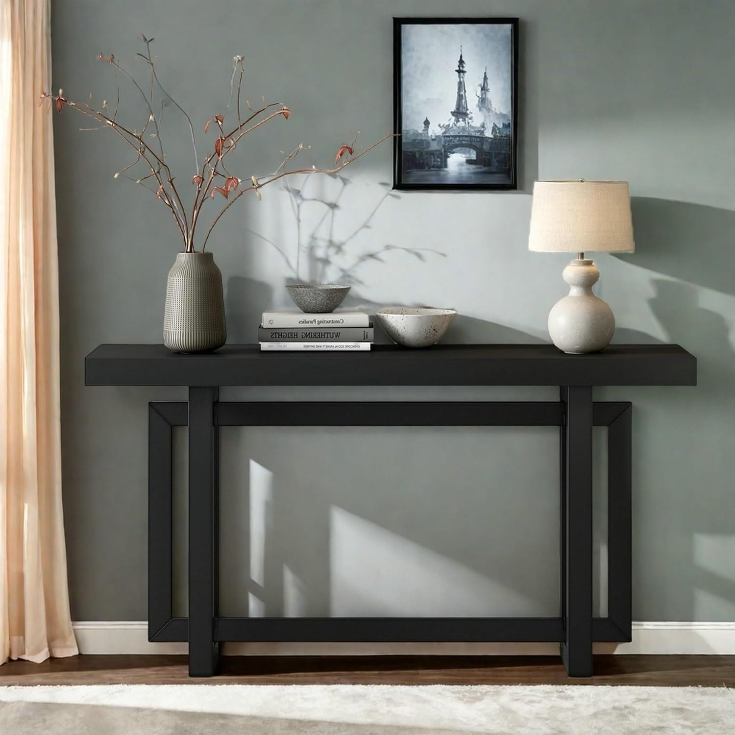 Solid Wood Console Table for Entryway, Modern Industrial Sofa Table with Wood Top, Long Hallway Table for Living Room, Black
