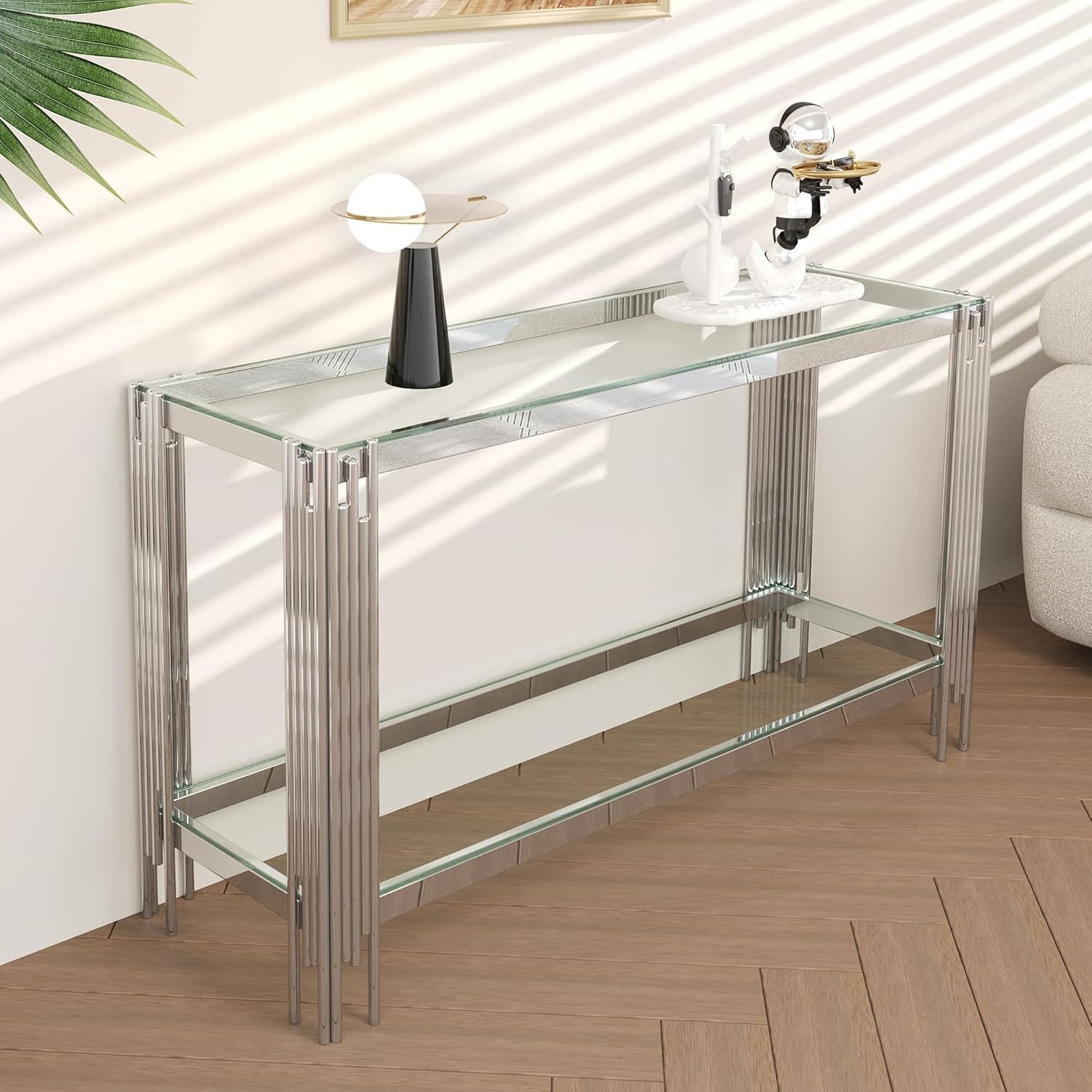 2-Tier Glass Console Table with Storage, Rectangular Sofa Table for Living Room Hallway, Clear & Silver