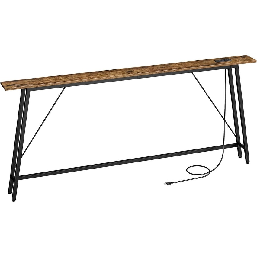 70.9" Narrow Console Table with Outlet, Skinny Sofa Table for Hallway, Entryway, Living Room, Rustic Brown and Black