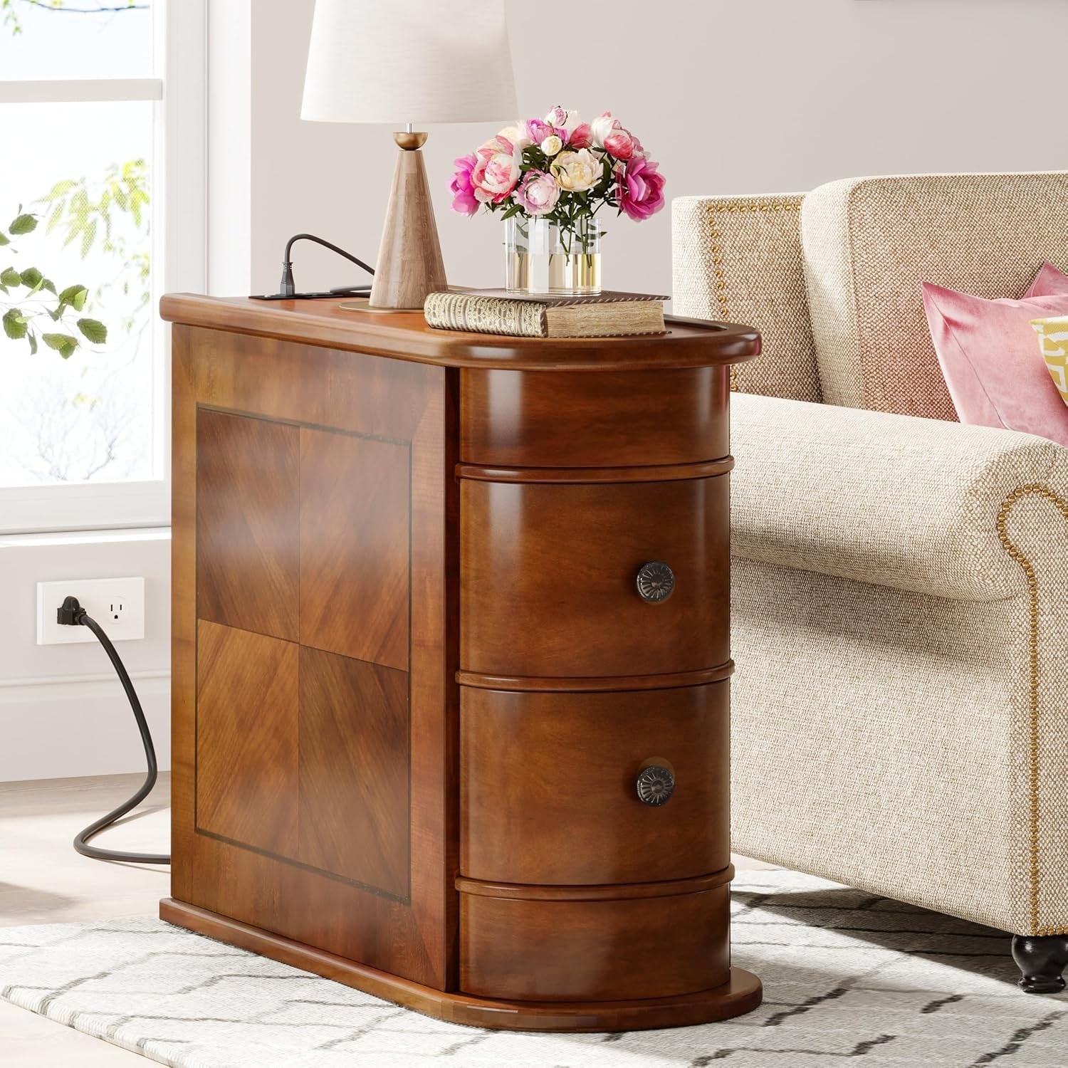 Solid Wood Slim End Table with Charging Station & 2 Drawers in Brown