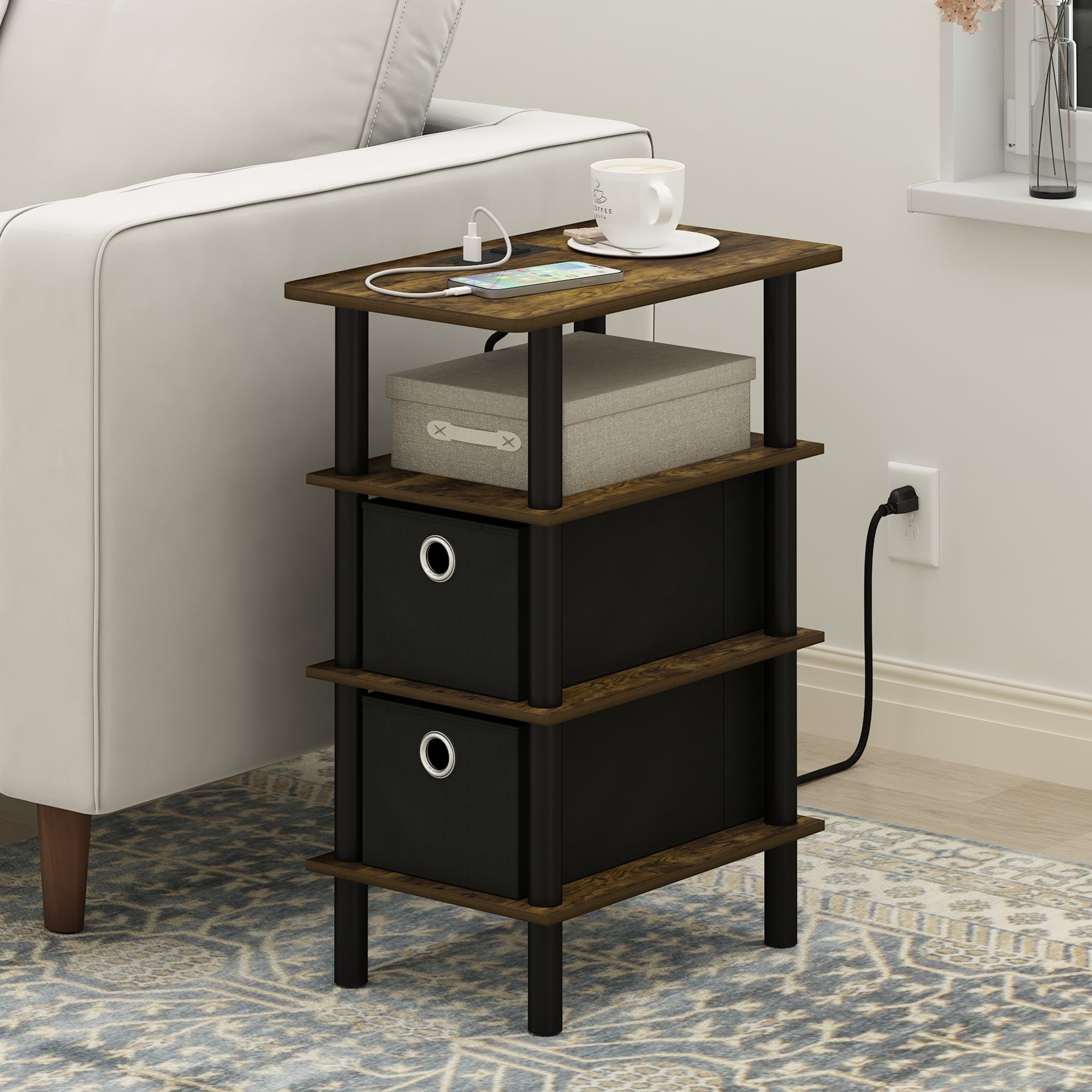 4-Tier Side Table with USB-C Charging, Drawers and Open Shelves for Bedroom or Office