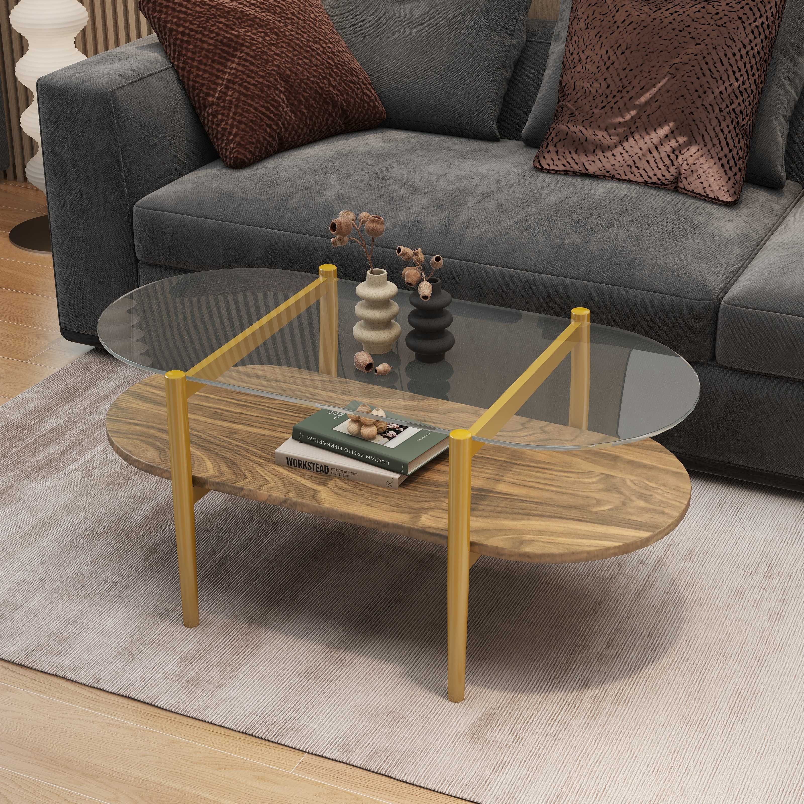 Oval Shaped Glass Coffee Table With Double-Layer Structure And Storage Function For Living Room