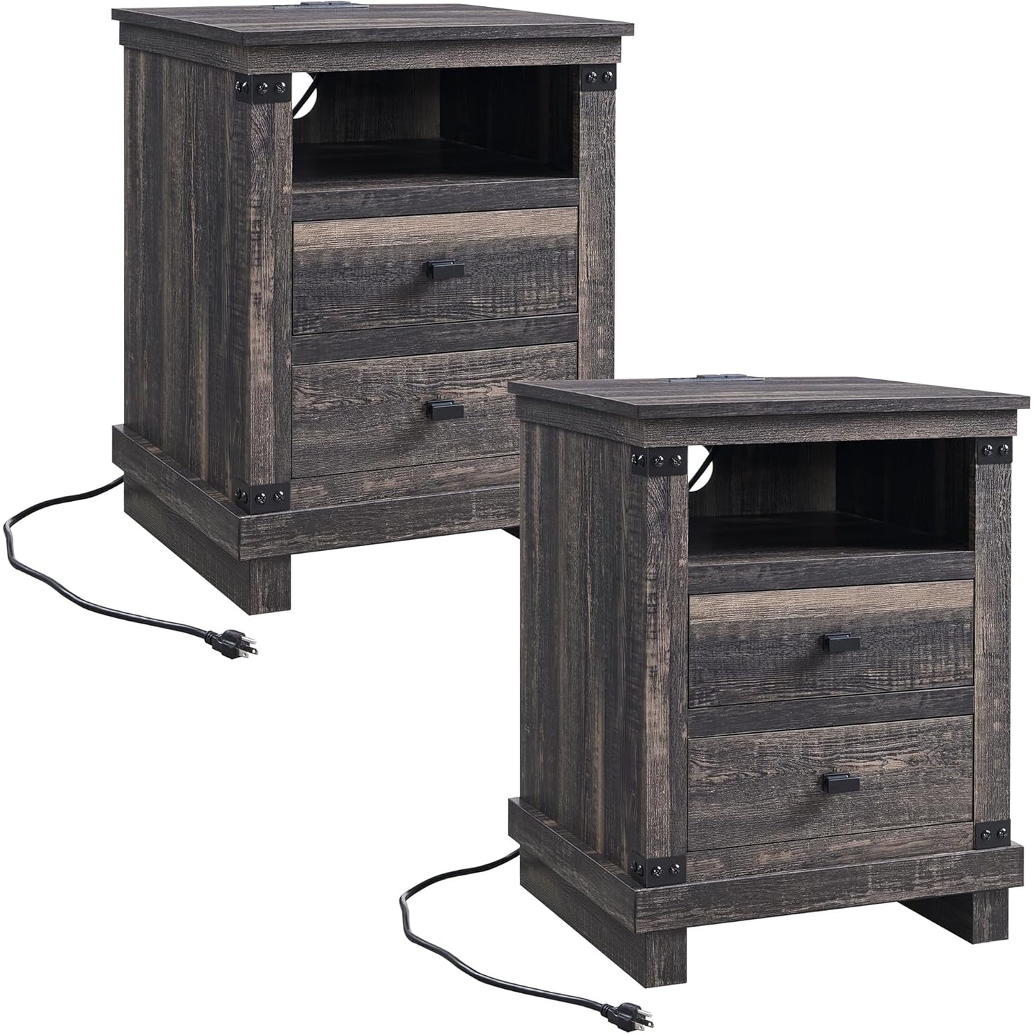 Rustic Nightstand Set of 2 with Charging Station, 18" Wood Bedside Table with Drawers, for Bedroom or Living Room