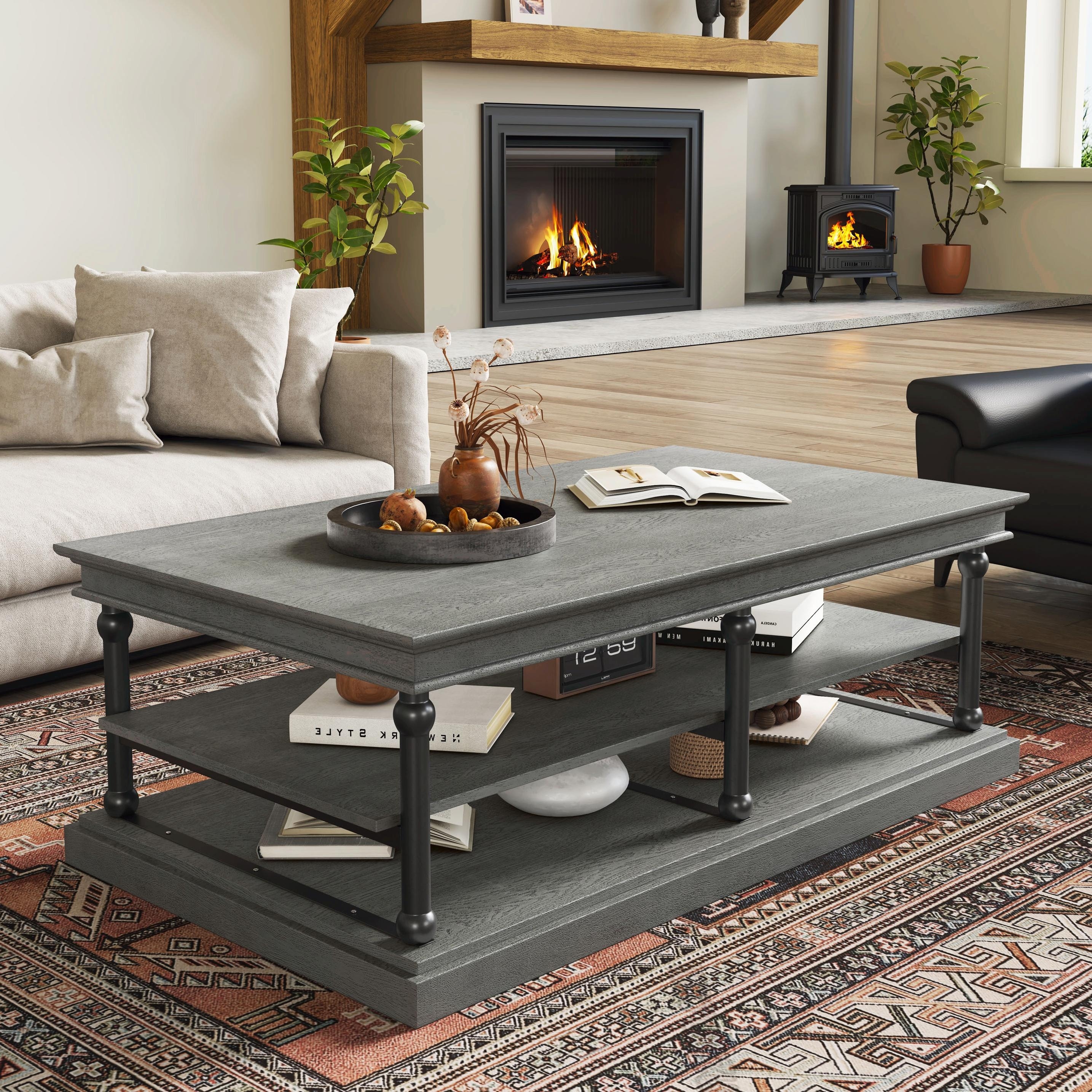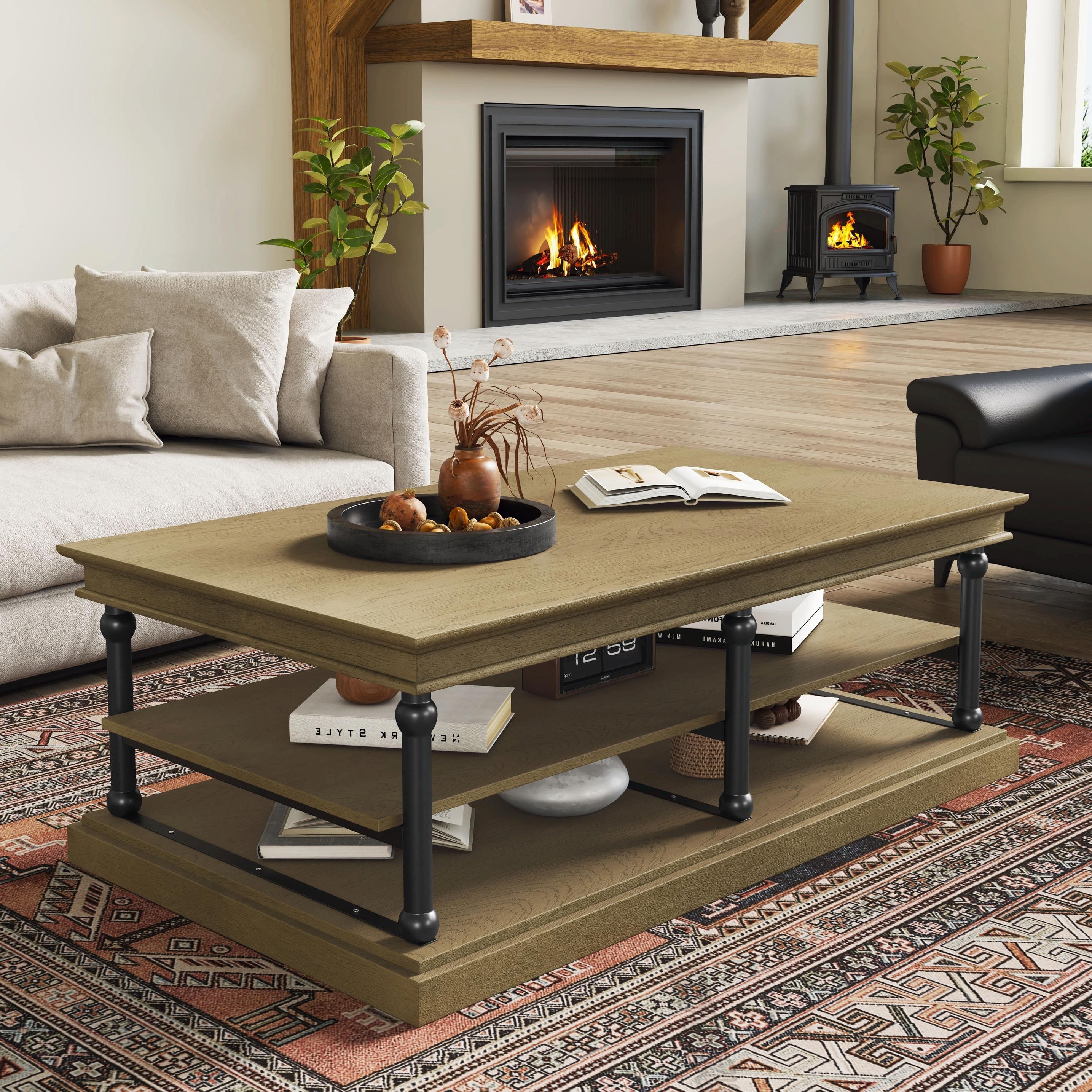 Solid Wood Coffee Table with 2 Open Shelves, Industrial Style
