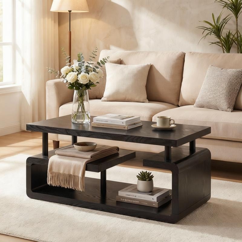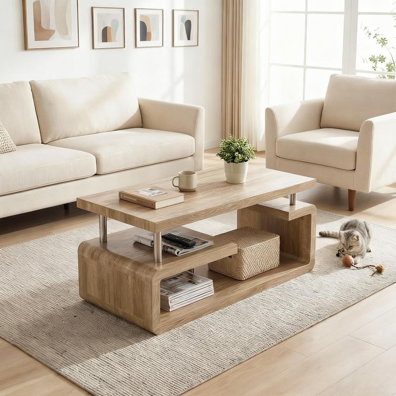 Rectangular 3-Tier MDF Coffee Table with Wood Grain Finish, Modern Multi-Layer Storage Open Compartments, for Living Room Office