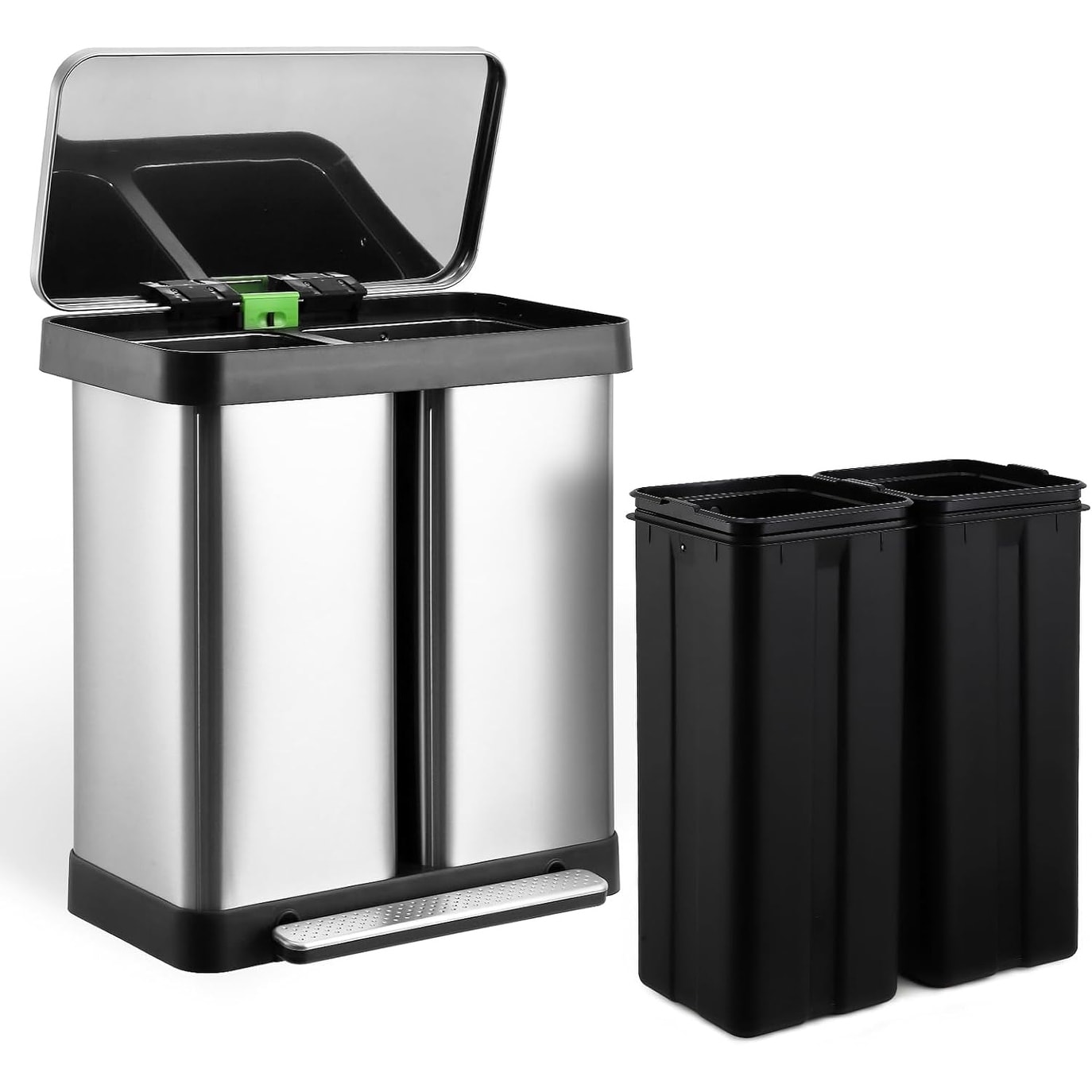 19 Gal Dual Kitchen Trash Can, Stainless Steel Recycling Bin with 2x9.5 Gal Liners & Soft-Close Lids