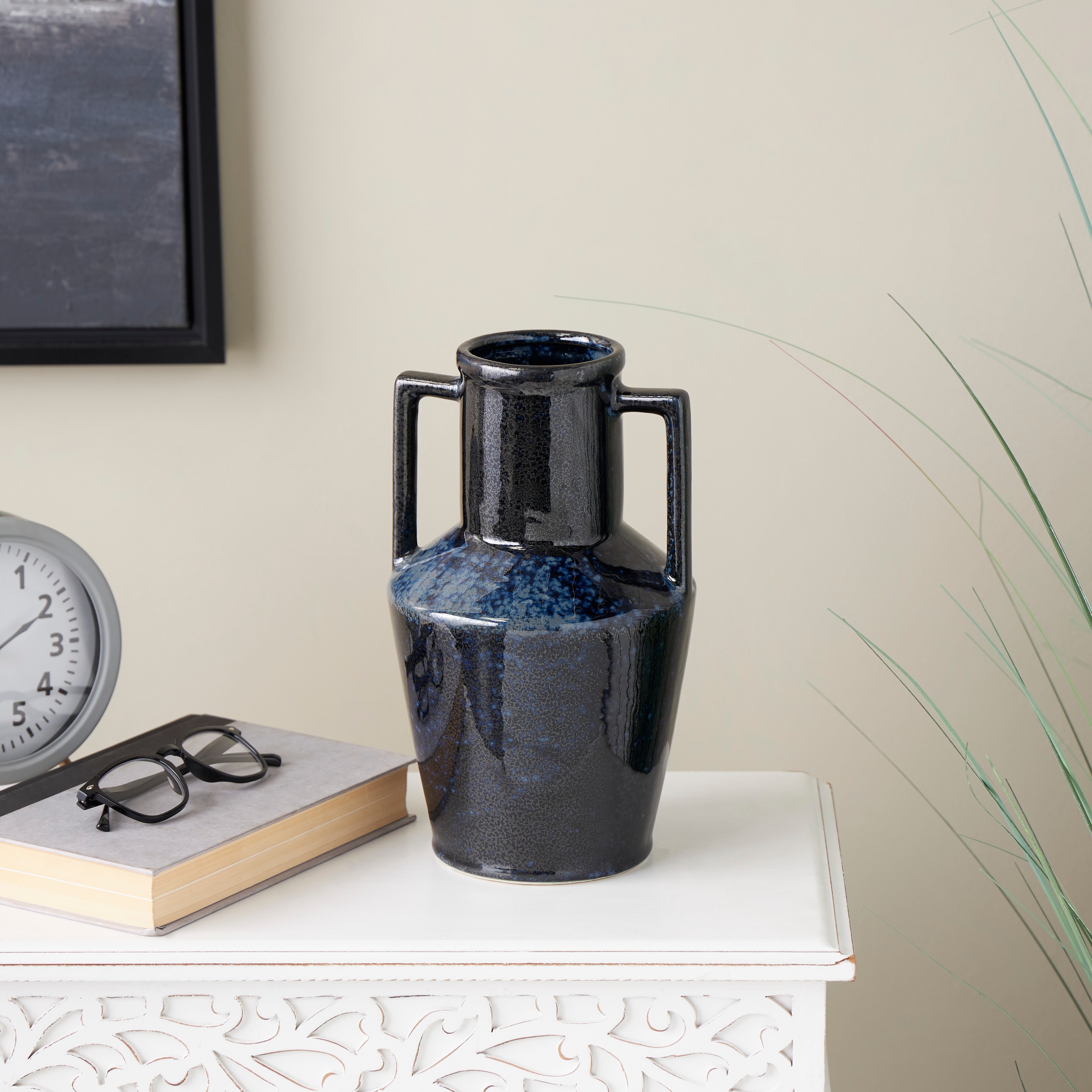 Dark Blue Ceramic Ombre Textured Decorative Vase with Rectangular Handles