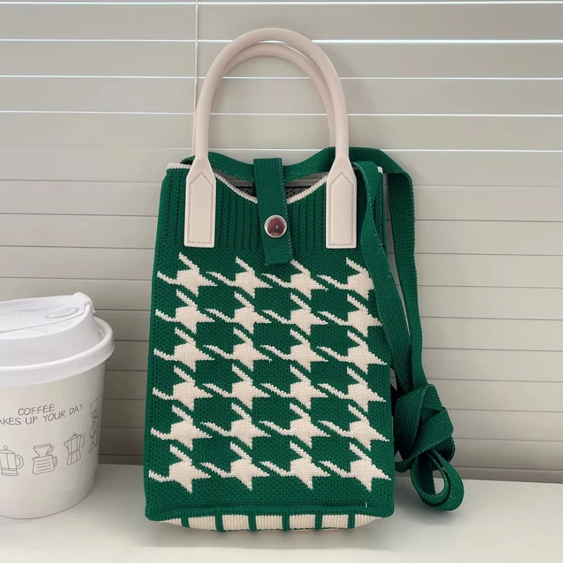 Women Korean Heart Knit Mini Square Handbag, Small Shoulder Bag, Girls Cute Outdoor Crossbody Purse For Phone green with Buckle