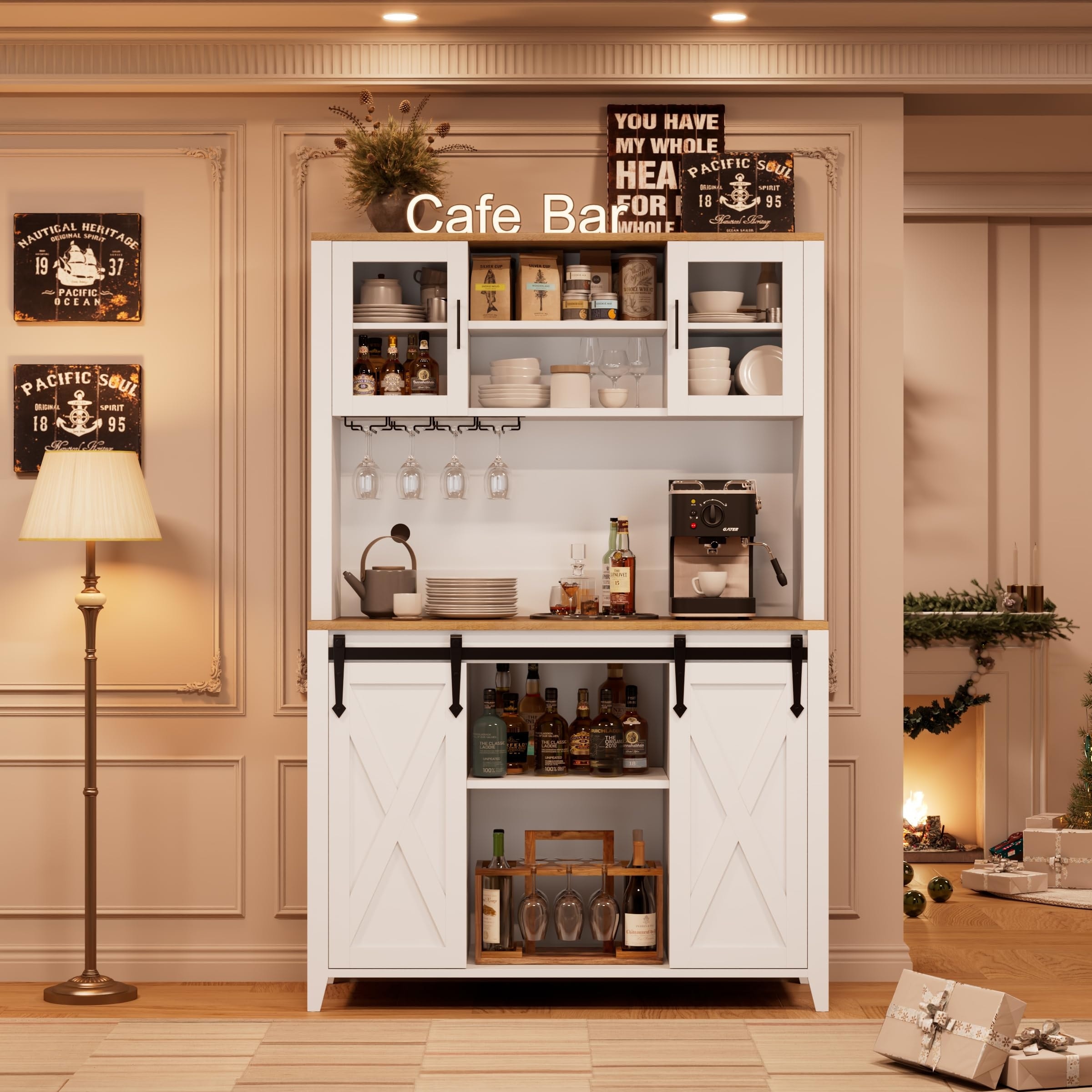 70" Wine & Coffee Bar Cabinet, Pantry Cabinet with Hutch, Sliding Barn Doors, Wine Racks & Glass Holders