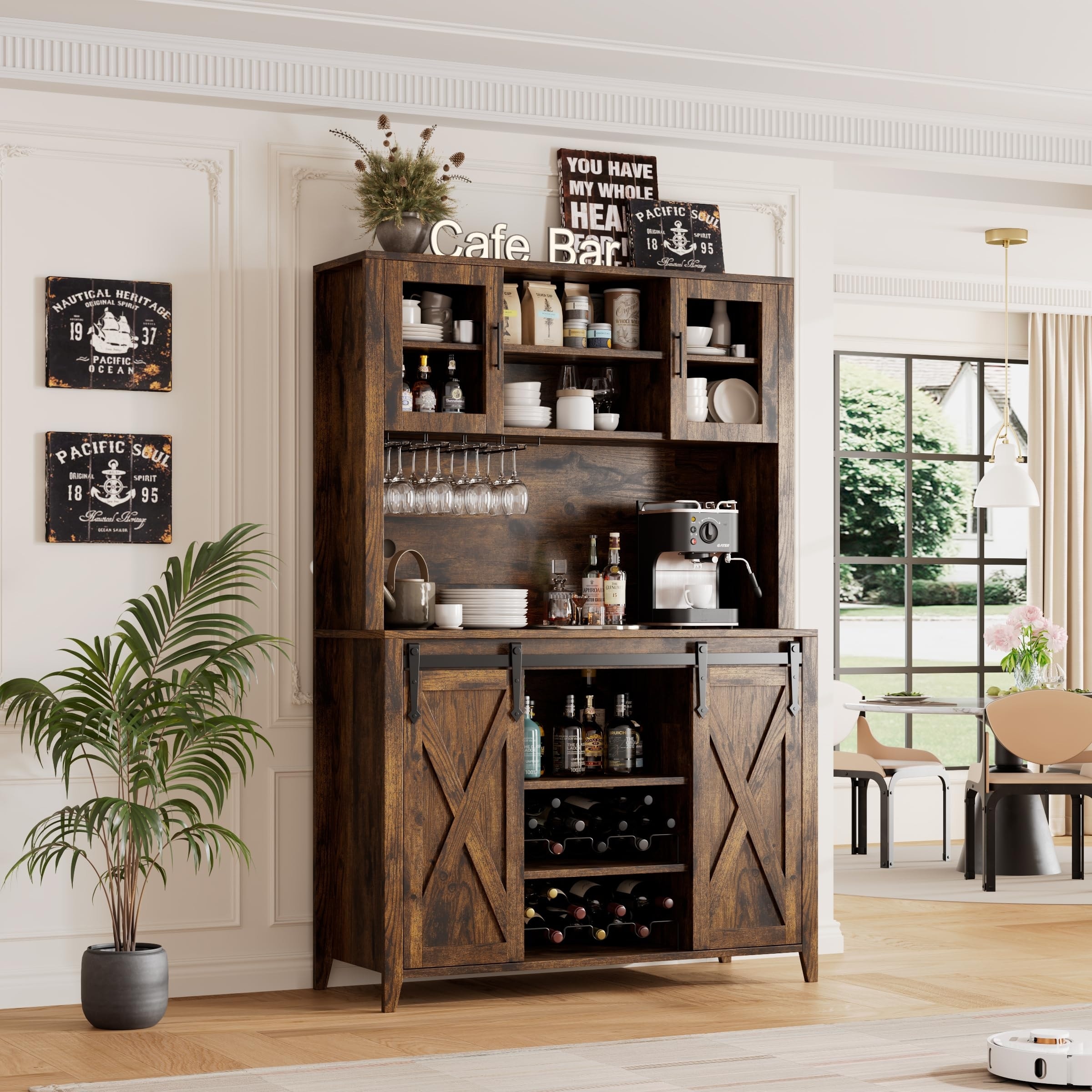 70" Wine & Coffee Bar Cabinet, Pantry Cabinet with Hutch, Sliding Barn Doors, Wine Racks & Glass Holders