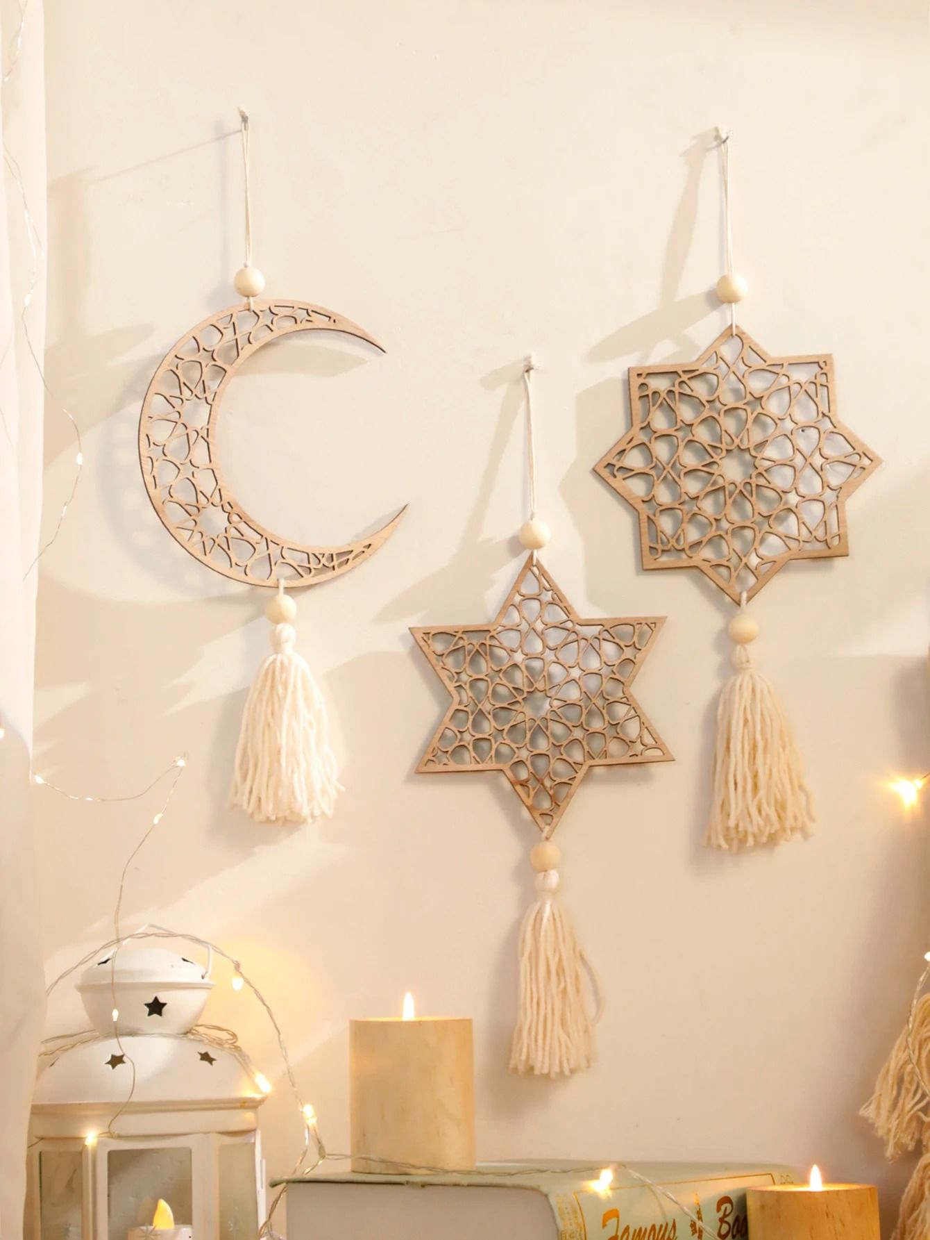 Wooden Ramadan Hanging Ornaments Eid Mubarak Moon Tassel Decor b