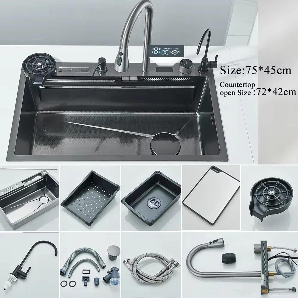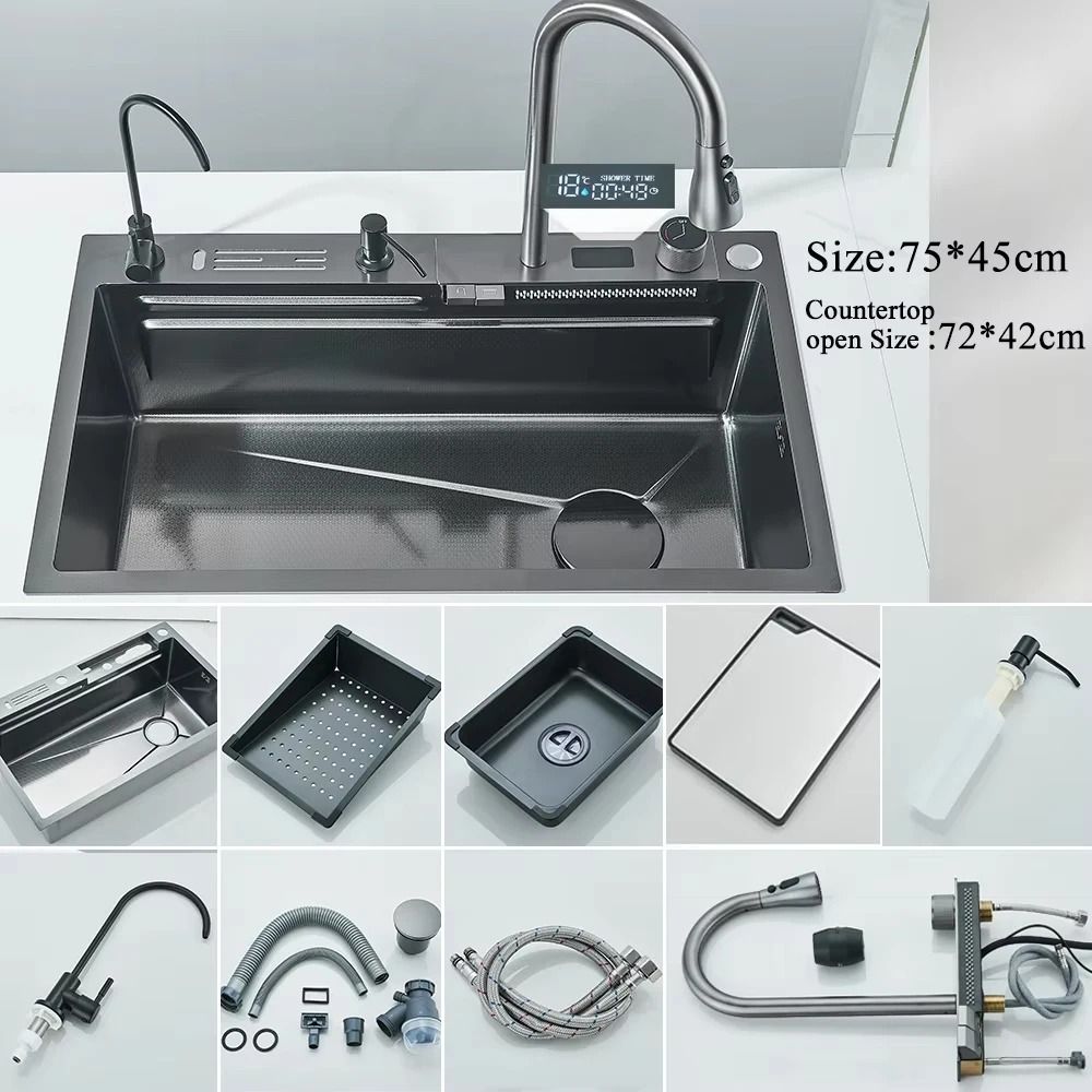Stainless Steel Waterfall Kitchen Sink With Digital Faucet And Accessories 29.5 X 17.7in 2 Button D1