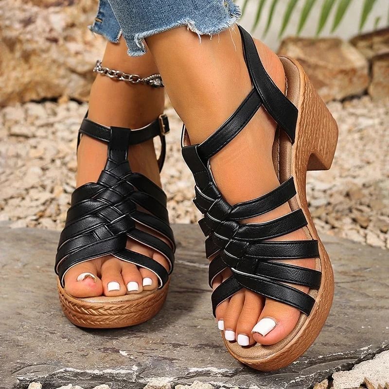 Hollow Weaving Chunky Heel Sandals Ankle Strap Platform Casual Beach Shoes us 9.5 black