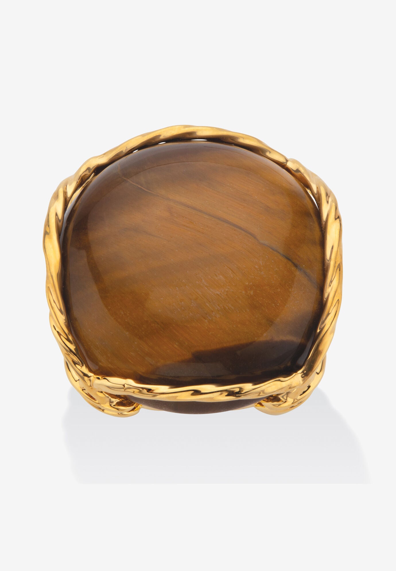 Wrap this around your finger. Exotic large Tiger's eye gemstone makes a bold impression atop this stunning ring designed with exaggerated twisted channel and intricate detailed setting. Styled in 14k gold-plate.Main Stone: 1 Special Cabachon Cut...