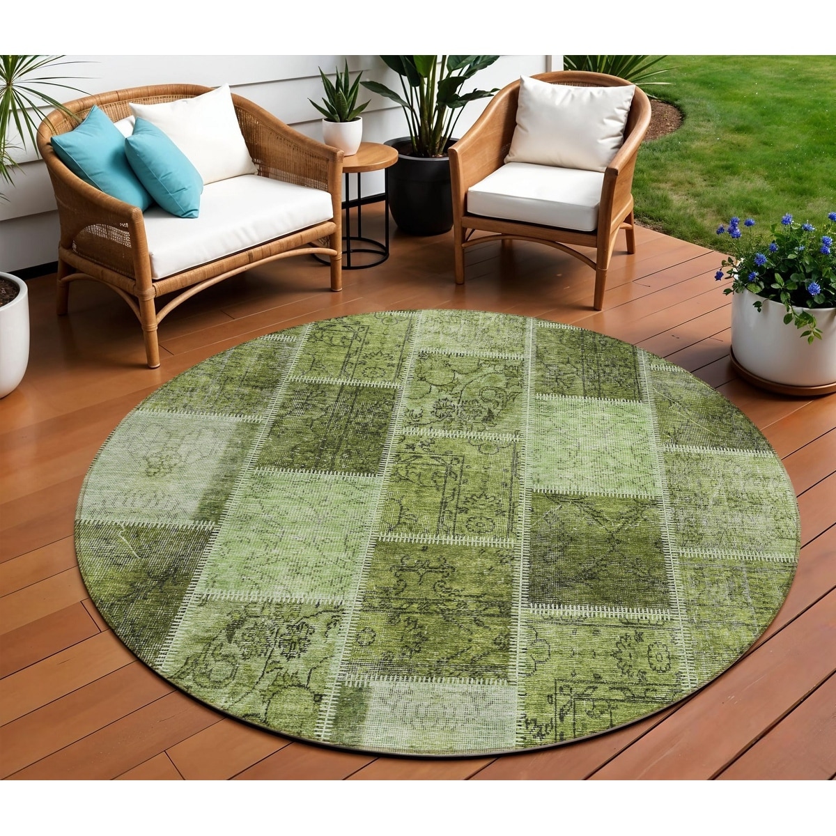 8' Olive Green And Artichoke Green Round Patchwork Washable Indoor Outdoor Area Rug - 7' x 7' Round
