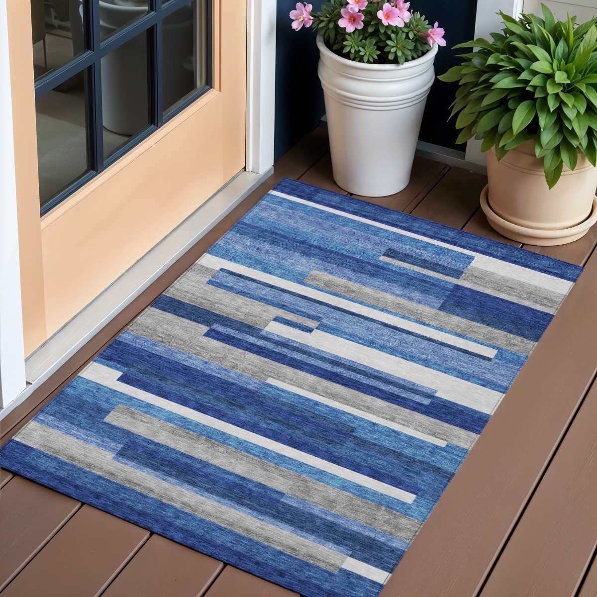 3' X 5' Navy Blue And Denim Blue Striped Washable Indoor Outdoor Area Rug - 3'6"