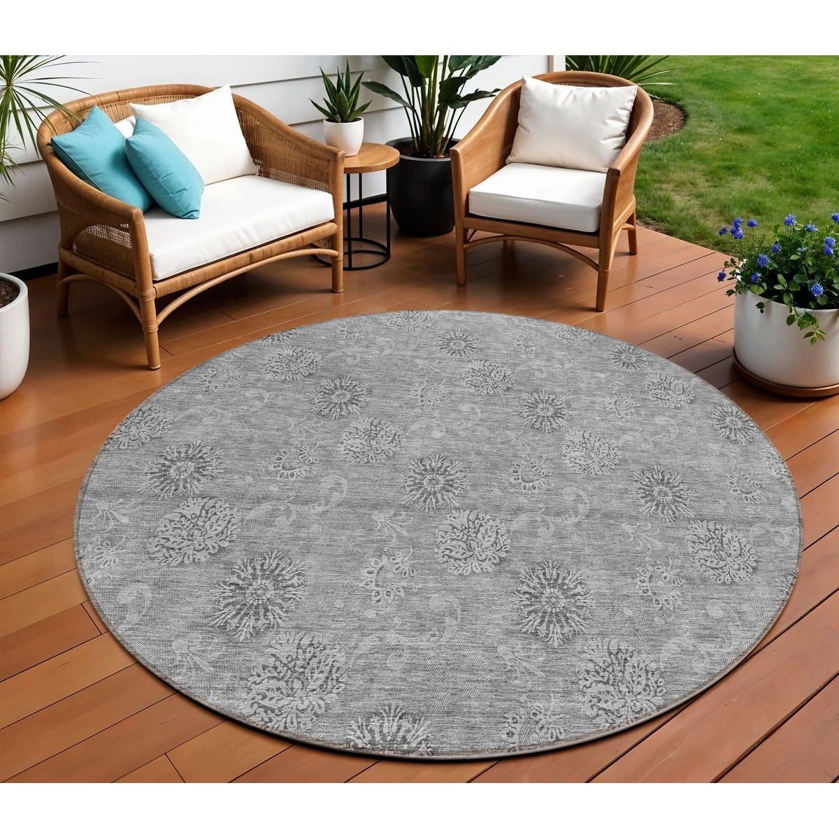 8' Pewter And Gray Round Floral Washable Indoor Outdoor Area Rug - 7' x 7' Round