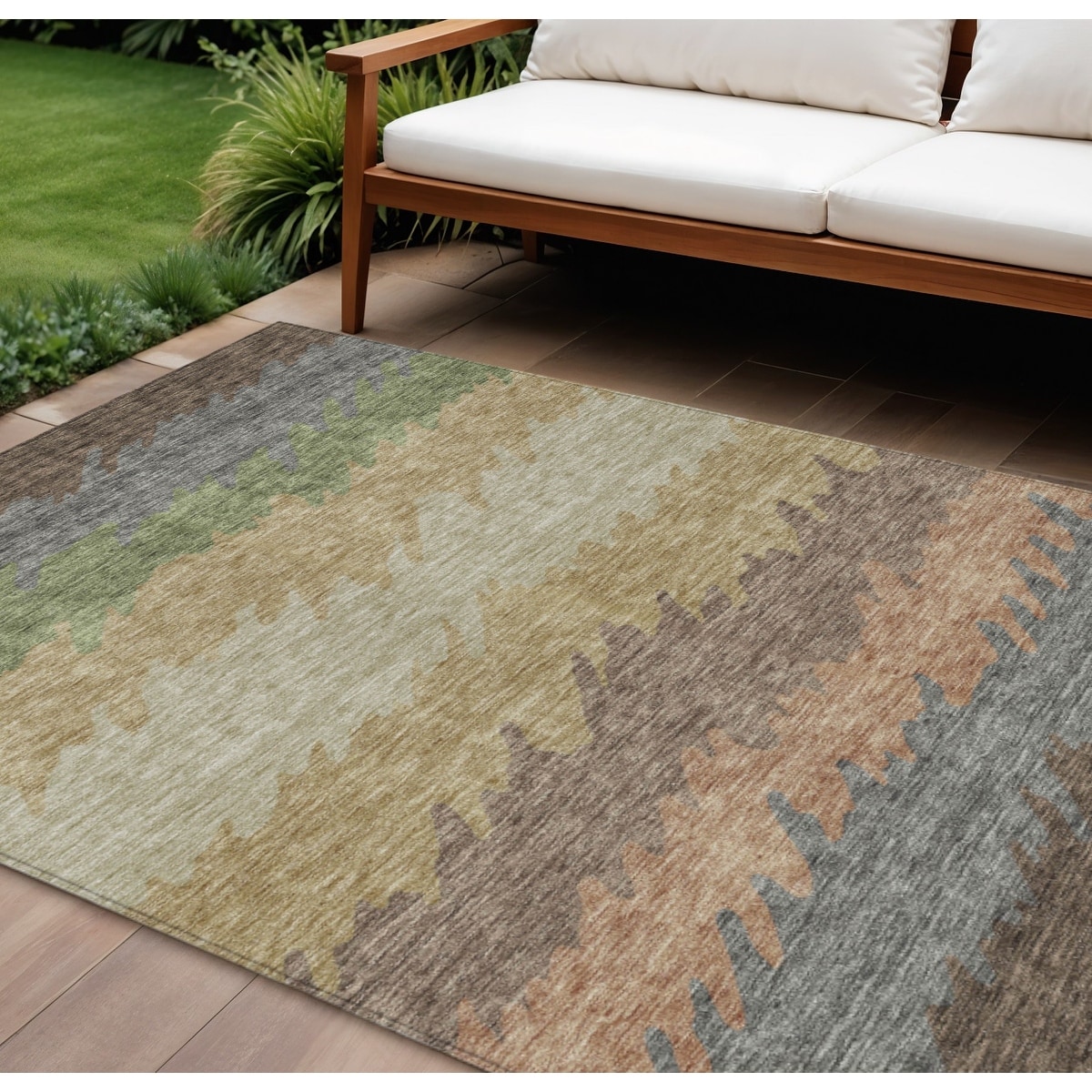 8' X 10' Chocolate Gray And Green Striped Washable Indoor Outdoor Area Rug - 9'3" x 12'3"