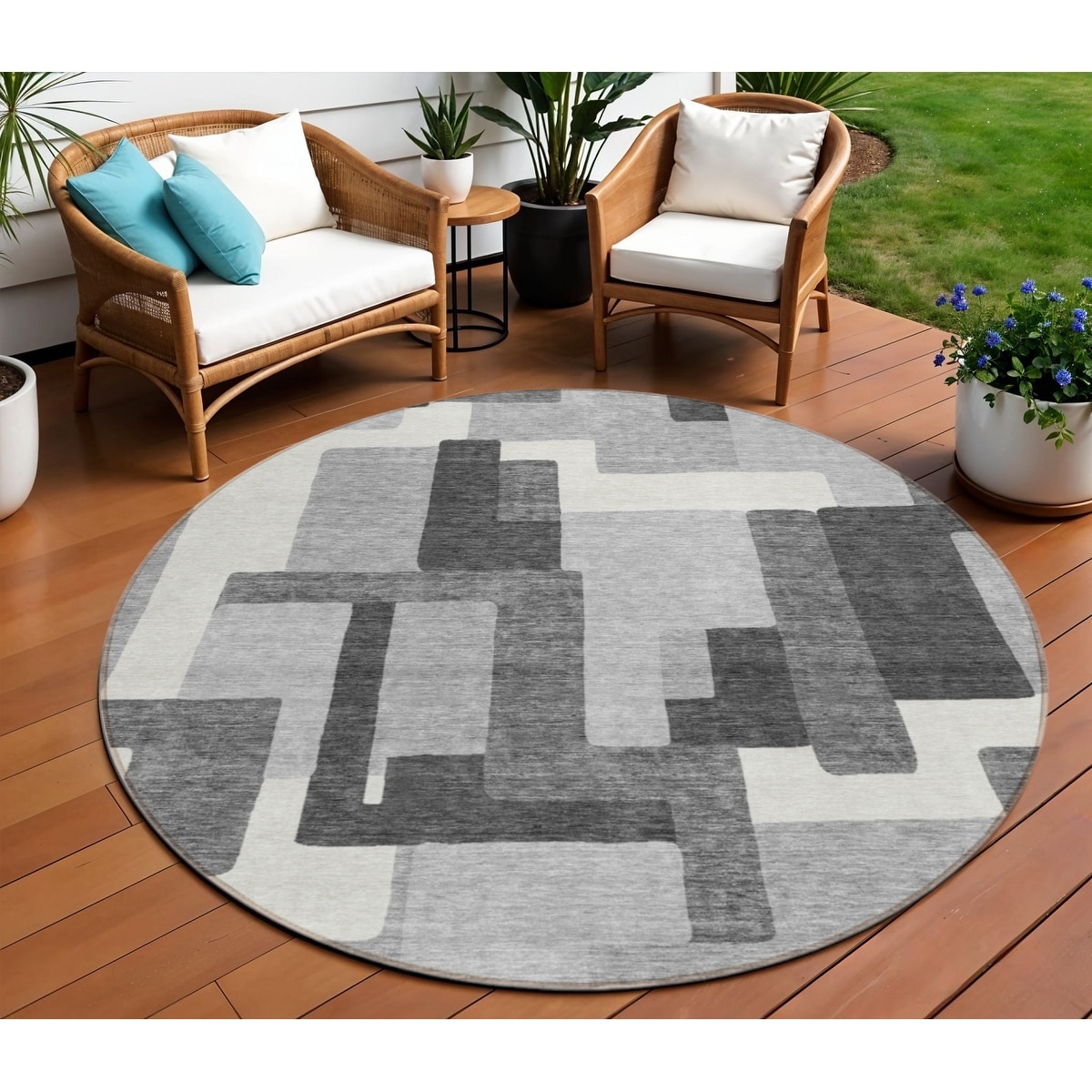 8' Gray Charcoal And Silver Round Abstract Washable Indoor Outdoor Area Rug - 7' x 7' Round