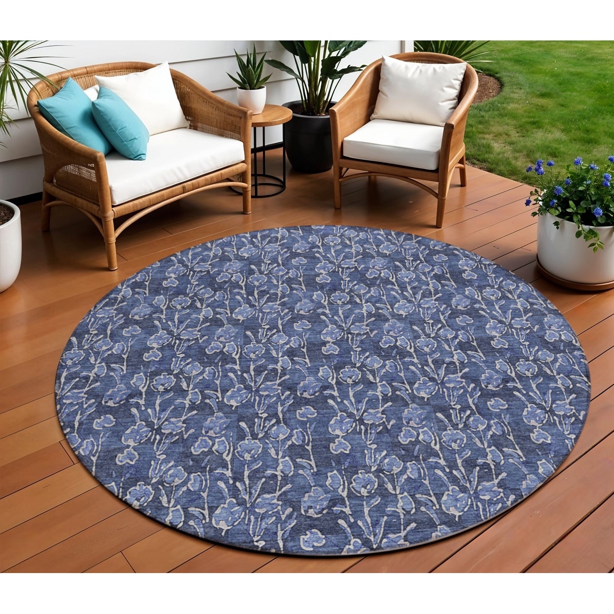 8' Navy Blue Denim Blue And Ivory Round Floral Washable Indoor Outdoor Area Rug - 7' x 7' Round