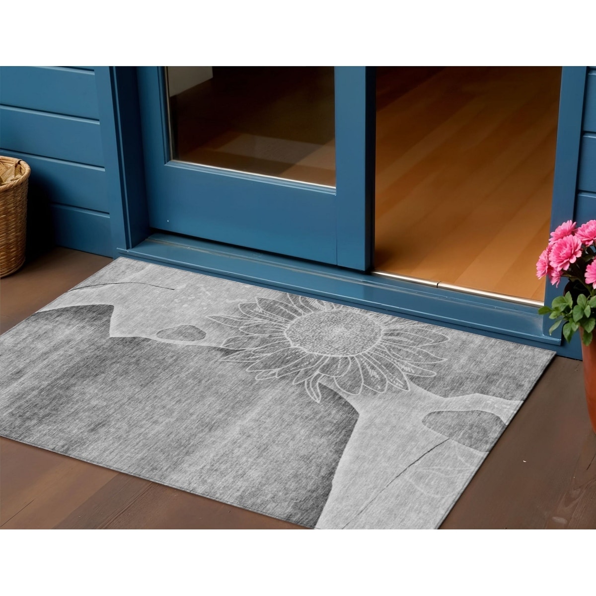 3' X 5' Gray Silver And Charcoal Floral Washable Indoor Outdoor Area Rug - 3'6"
