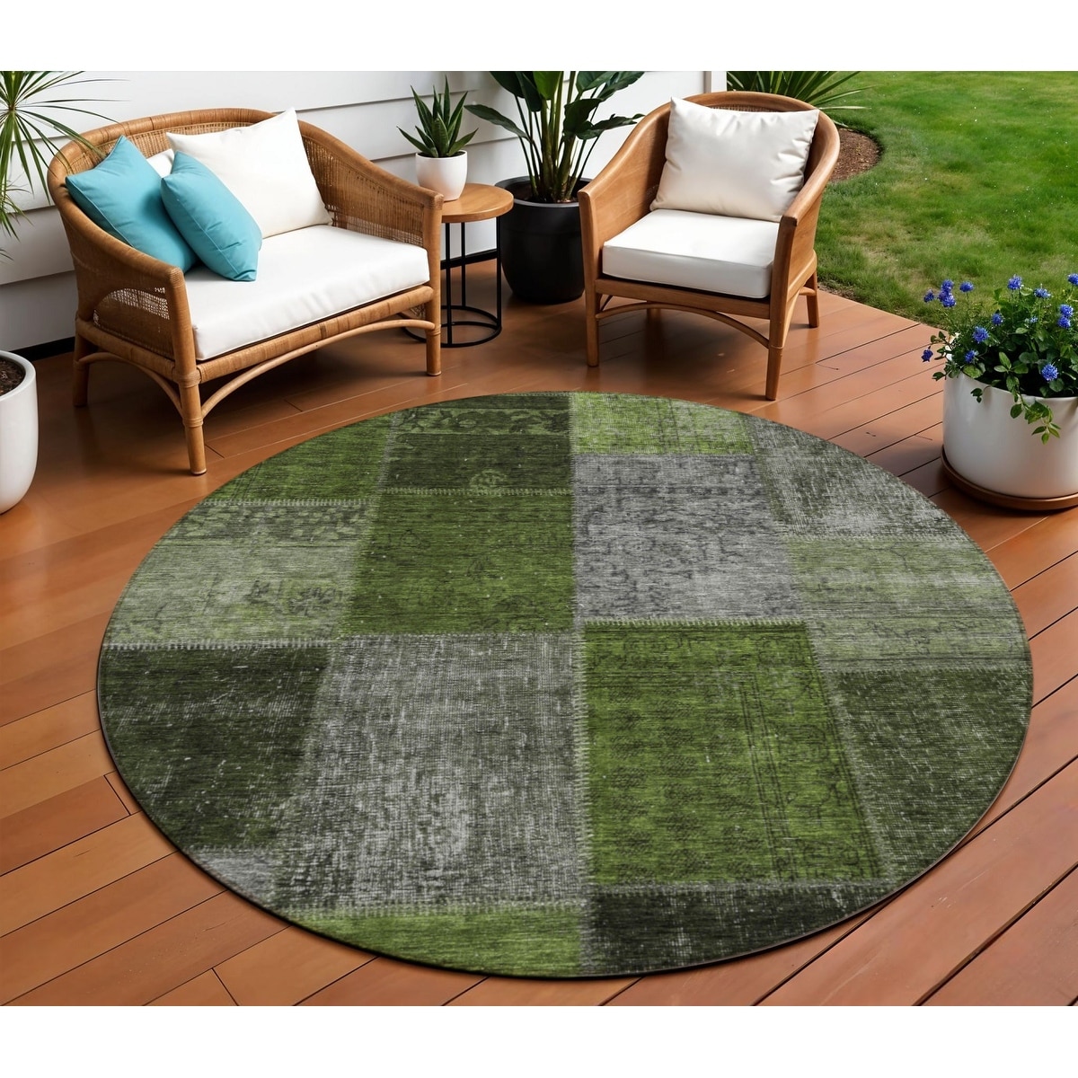 8' Olive Green And Artichoke Green Round Patchwork Washable Indoor Outdoor Area Rug - 7' x 7' Round