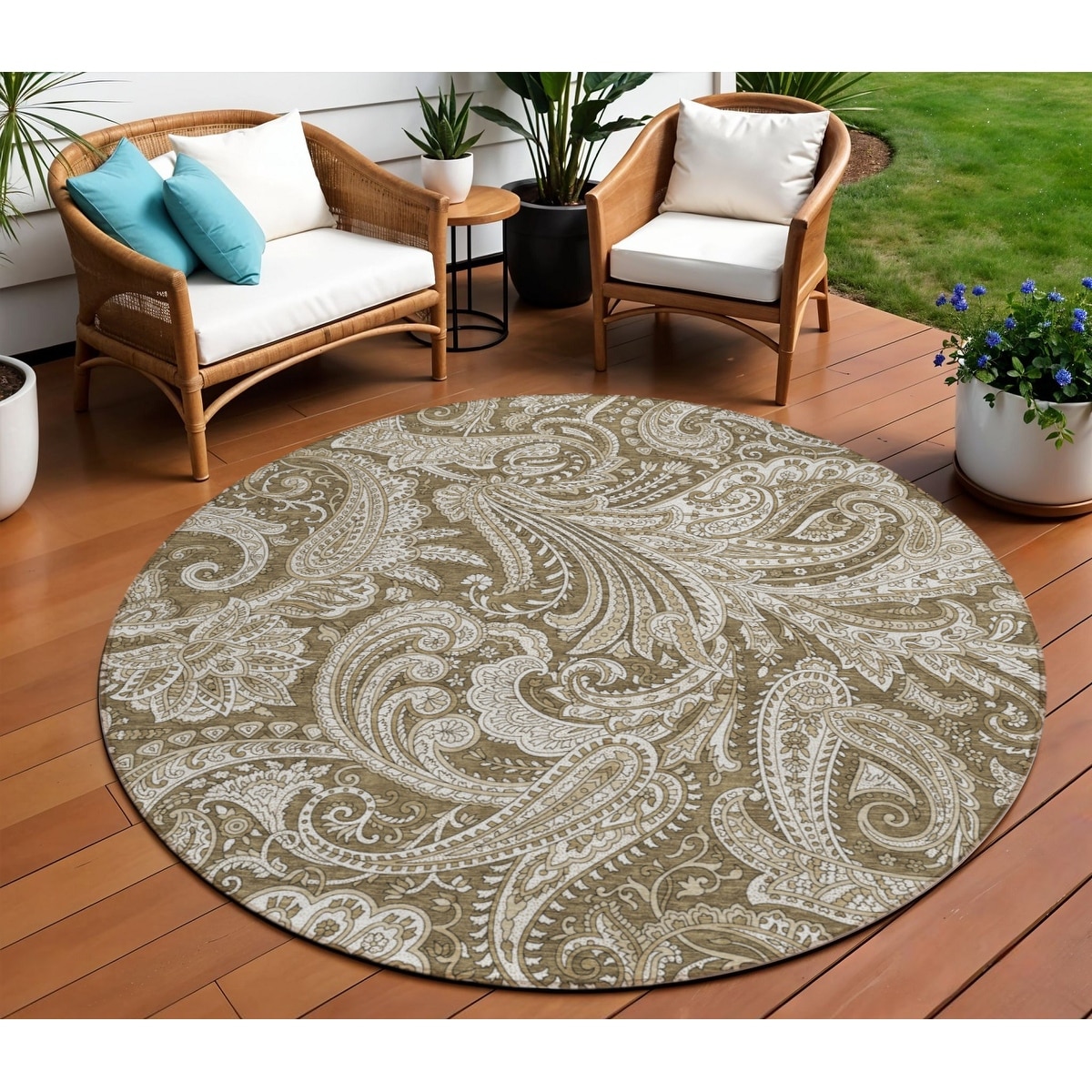 8' Chocolate Beige And Ivory Round Paisley Washable Indoor Outdoor Area Rug - 7' x 7' Round