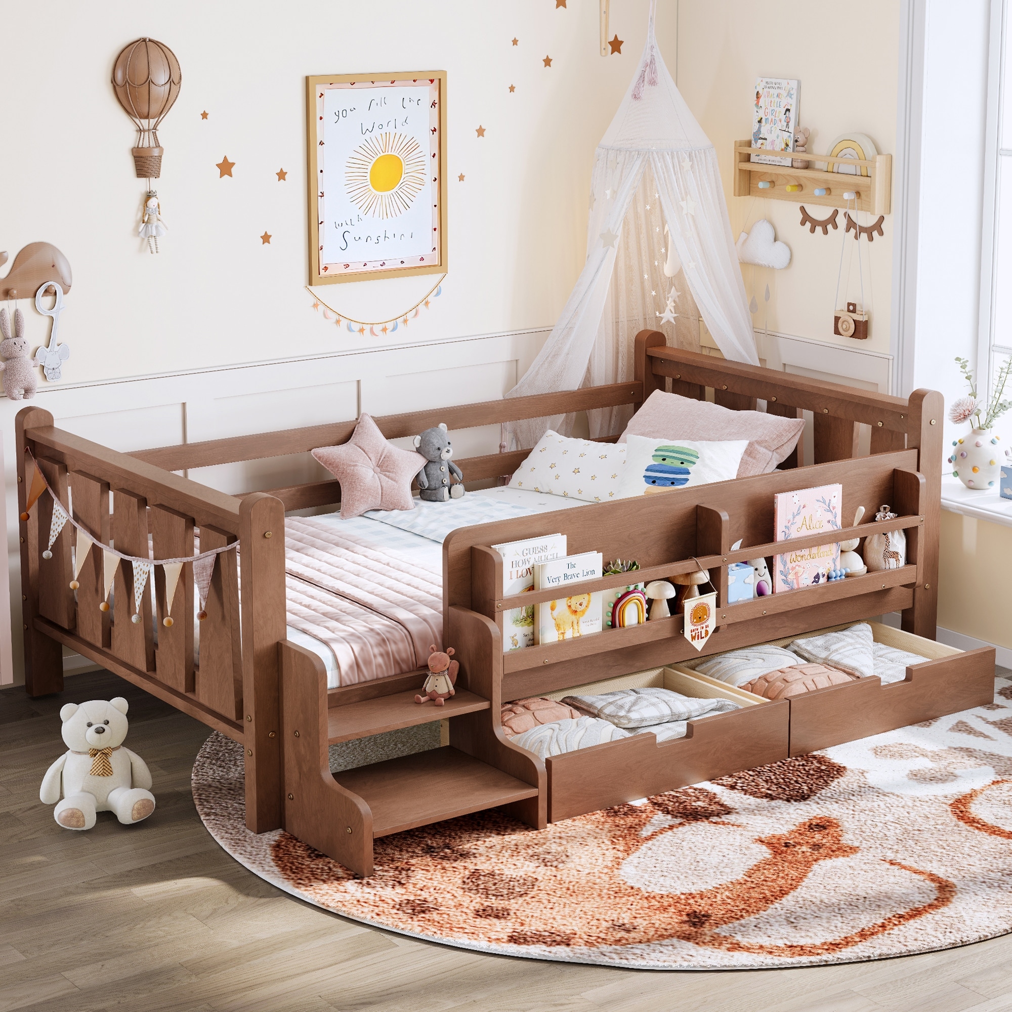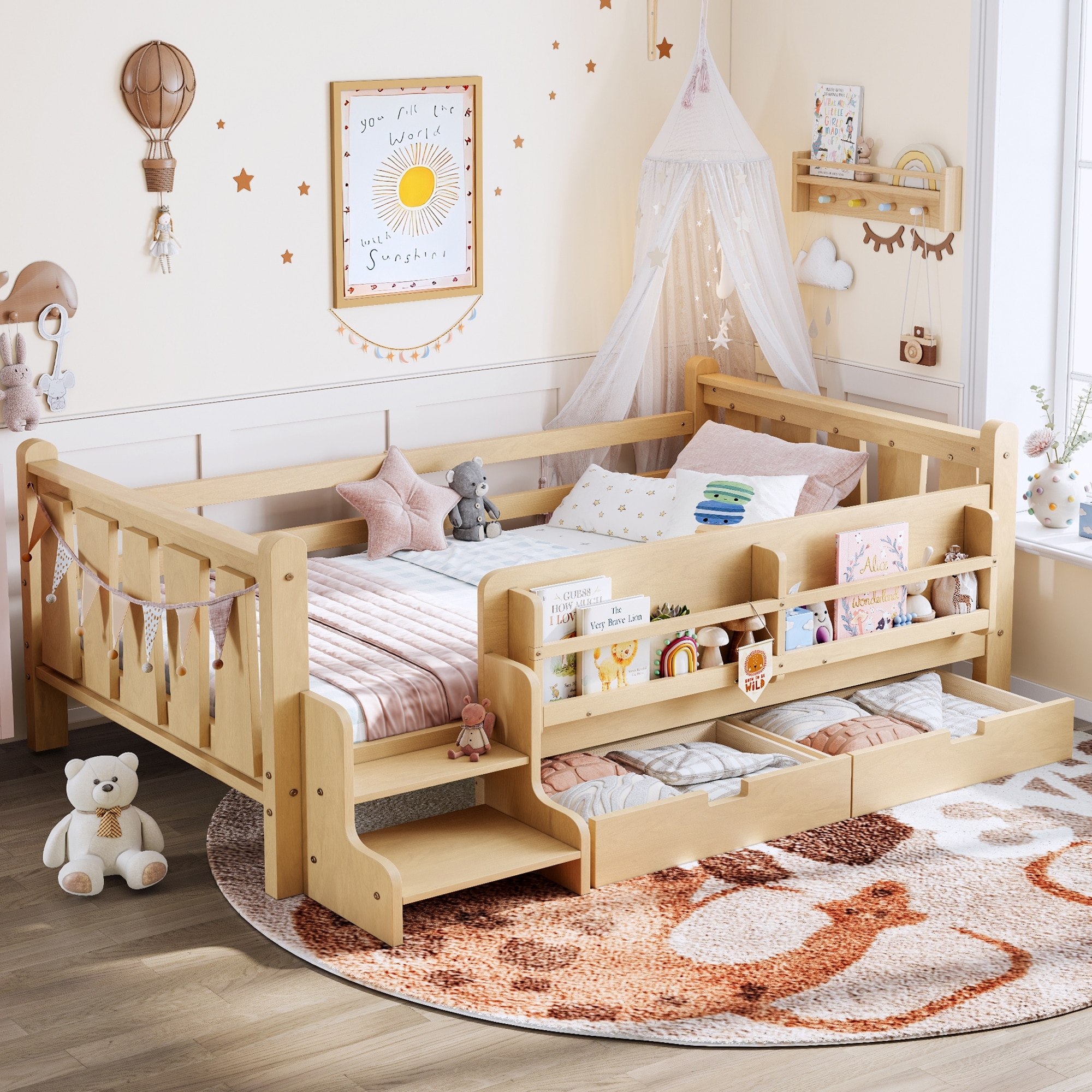 Twin Size Floor Bed with Storage Bookcases and Drawers, Solid Wood Kids Floor Bed with Cute Stairs and Guardrails