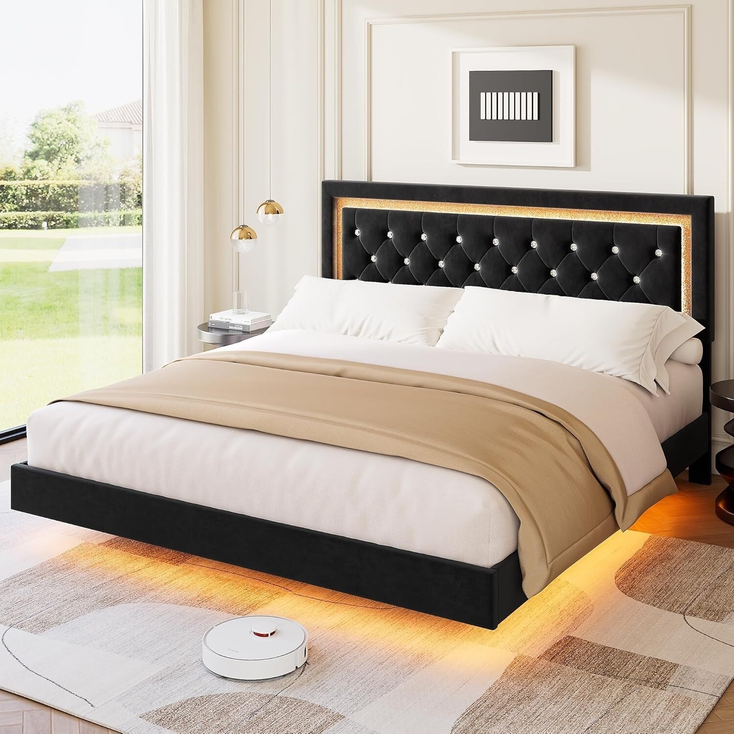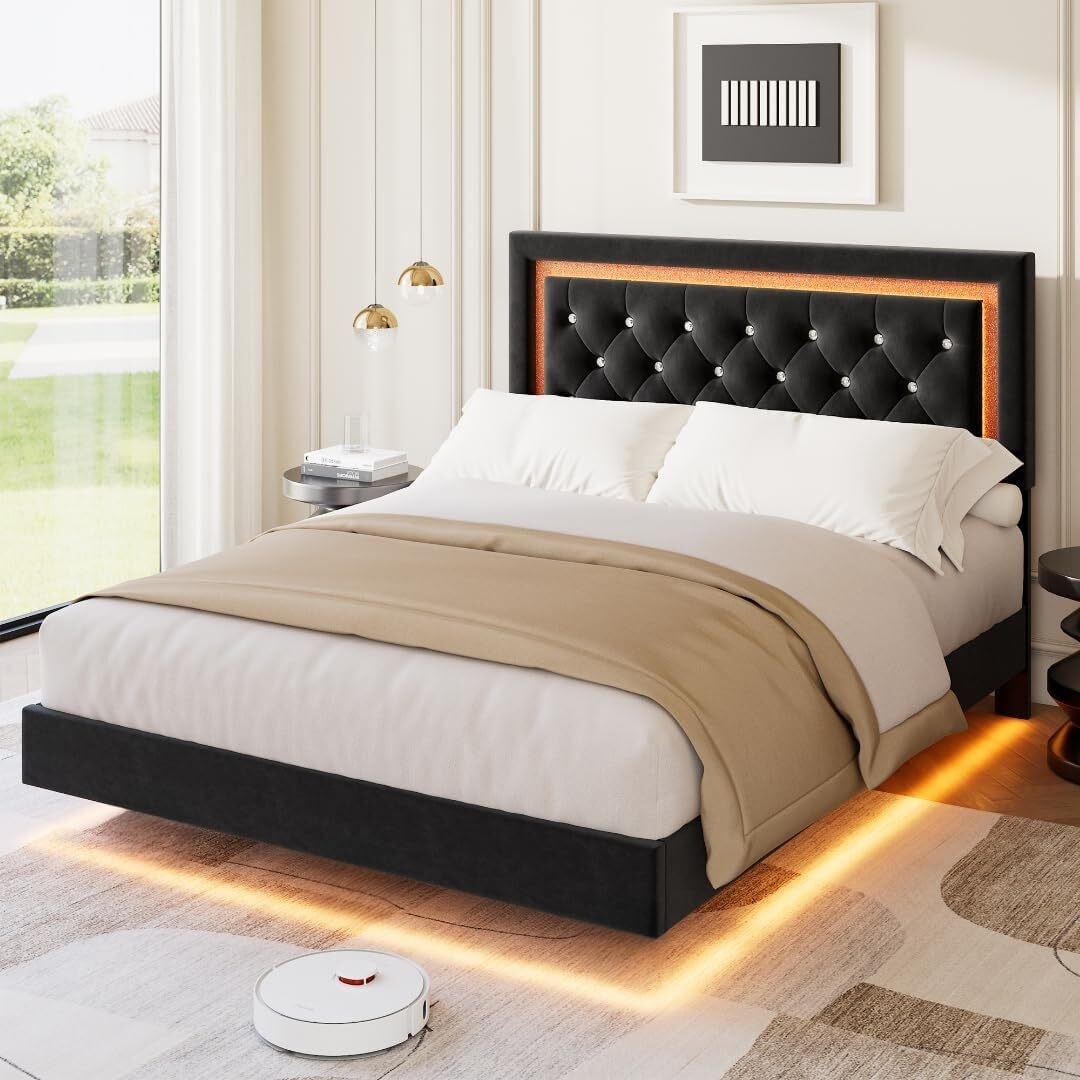 Floating Upholstered Platform Bed Frame with Smart Led Lights, Black