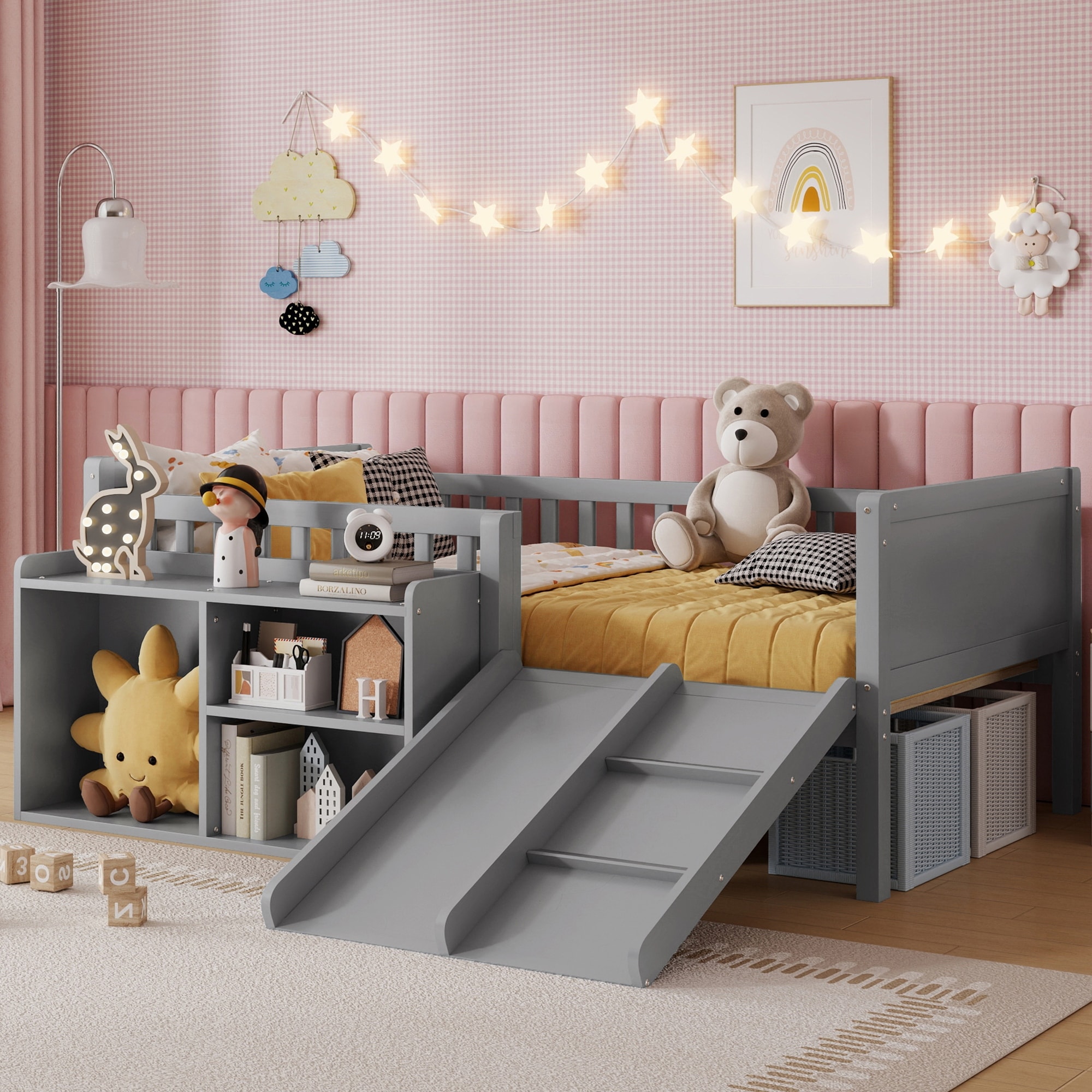 Roomfitters Twin Low Loft Platform Bed, Slide and Movable Bookshelf with Wooden Frame for Bedroom or Playroom