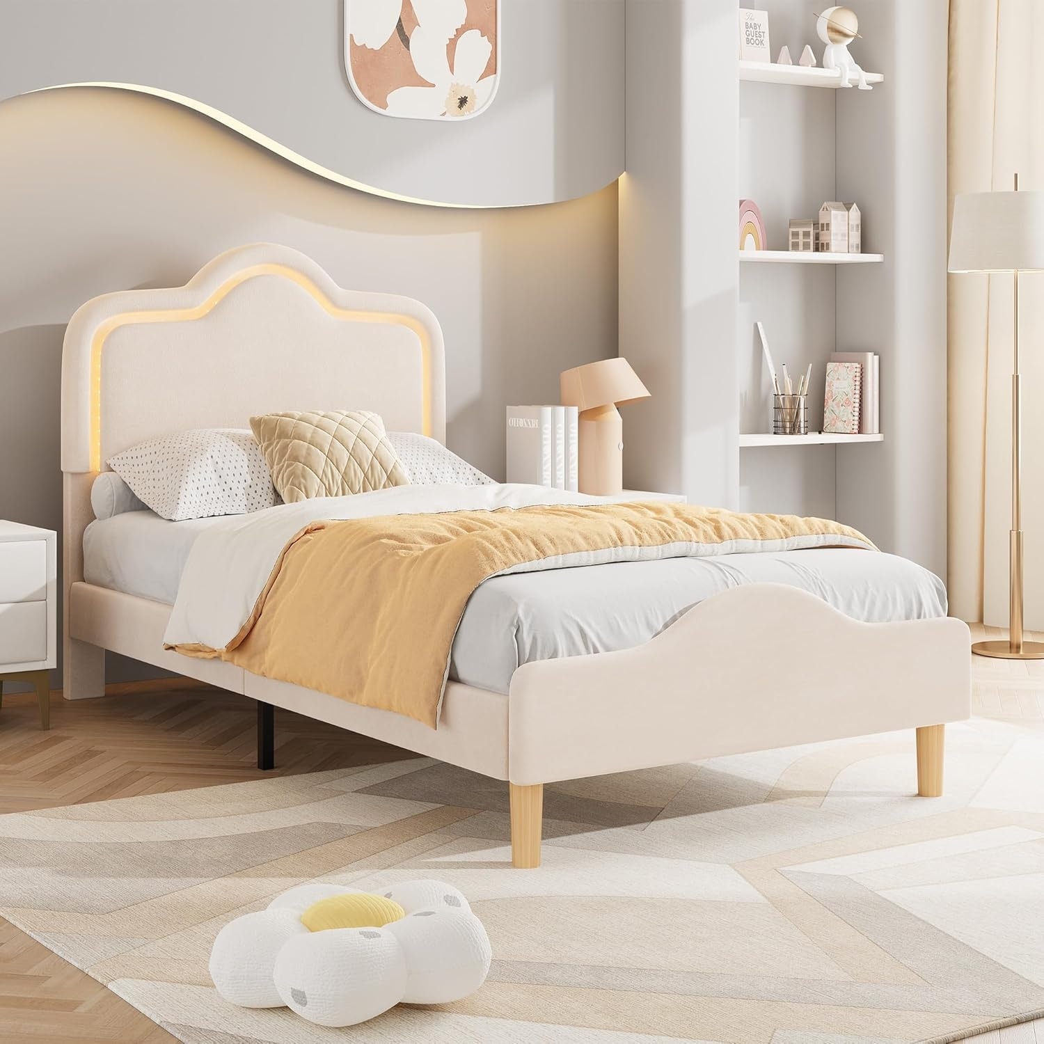 Twin-XL Bed with Adjustable LED Velvet Headboard
