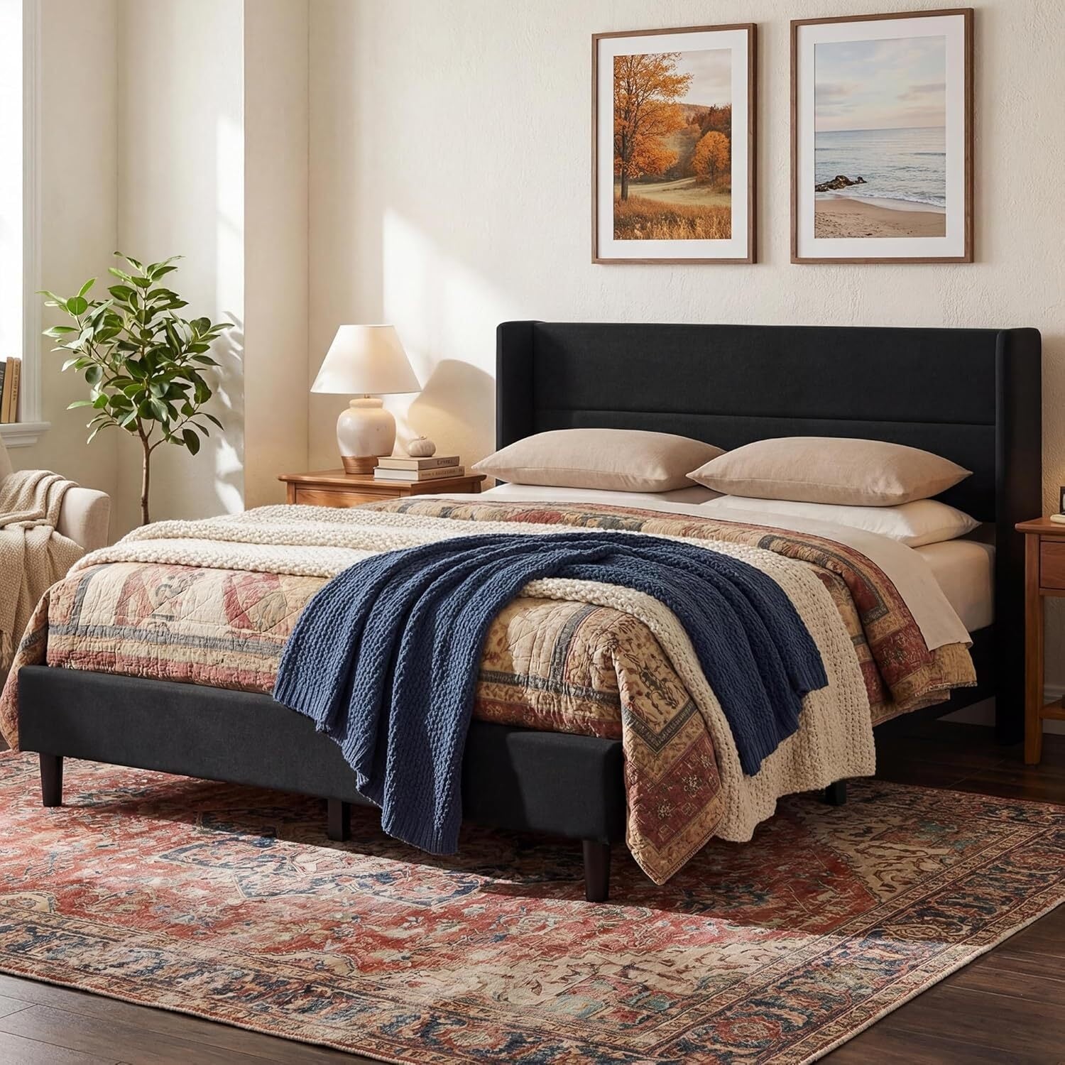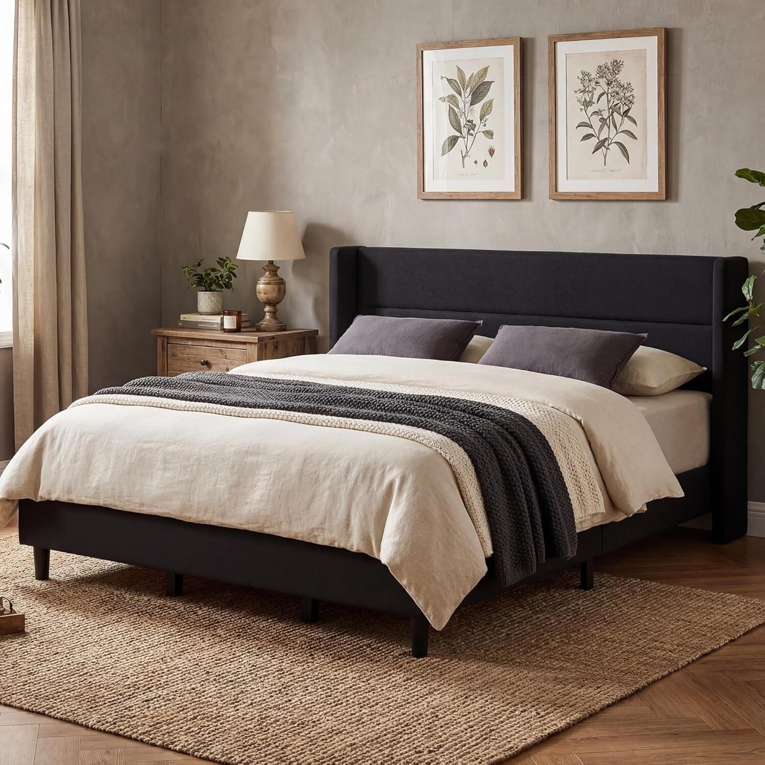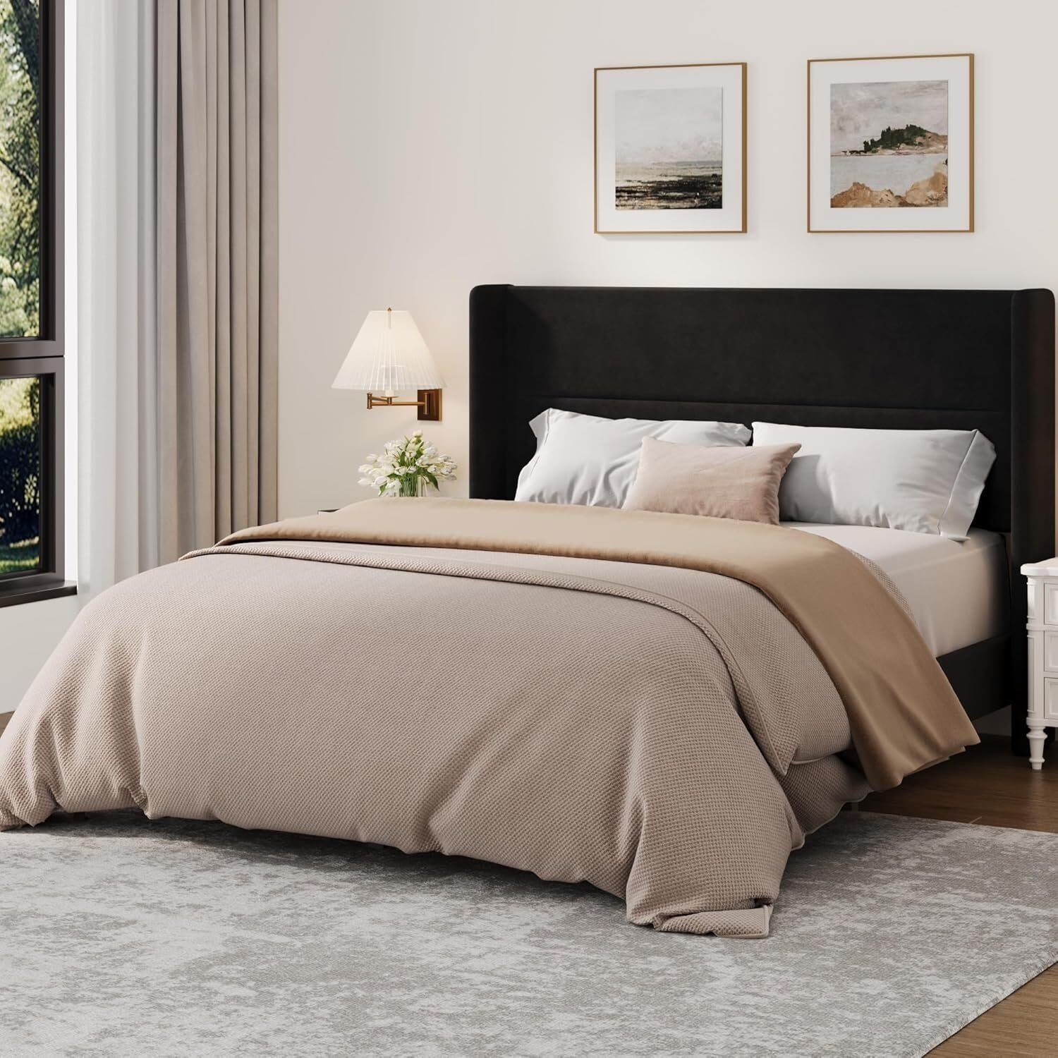 Velvet Upholstered Platform Bed Frame with Tufted Wingback Headboard, Black