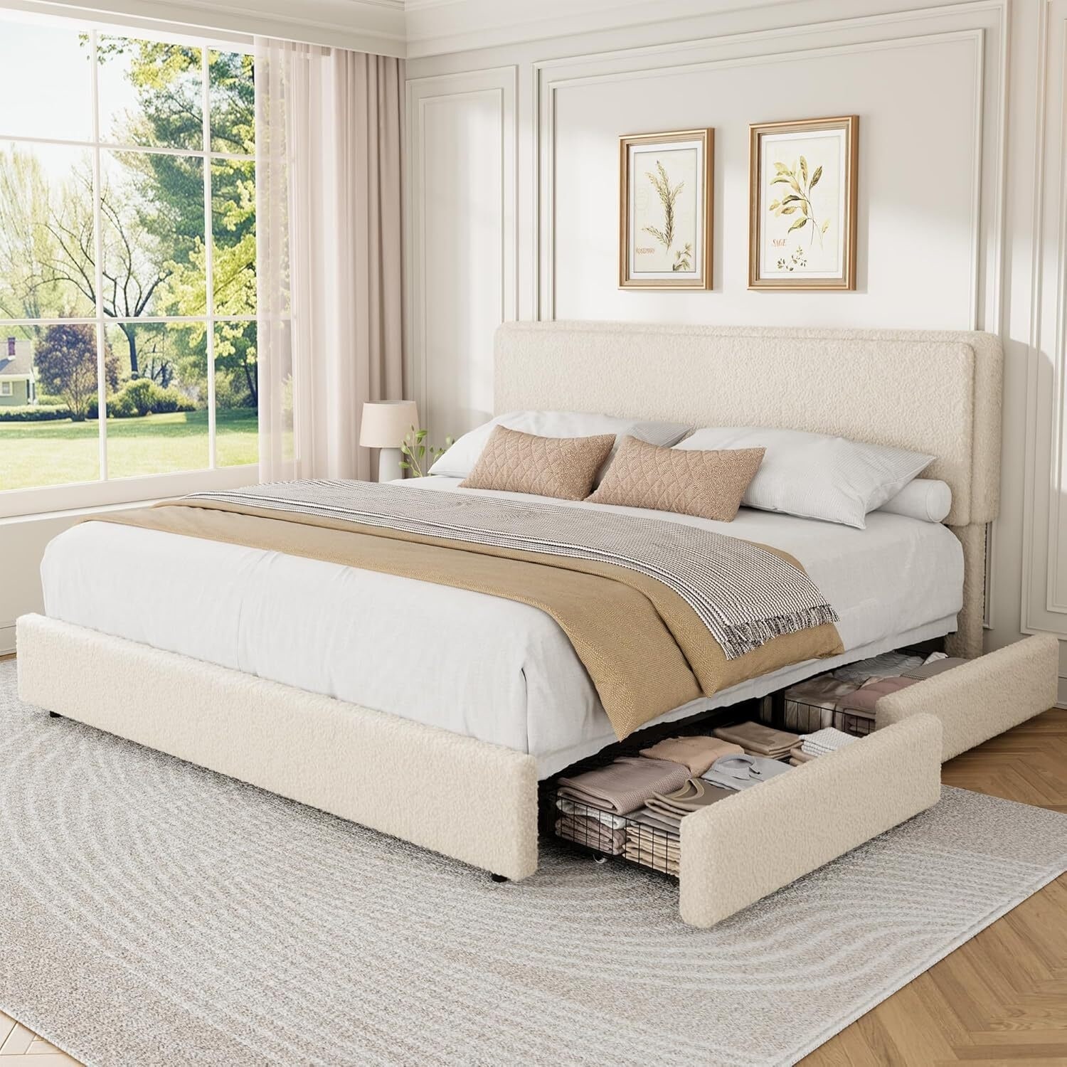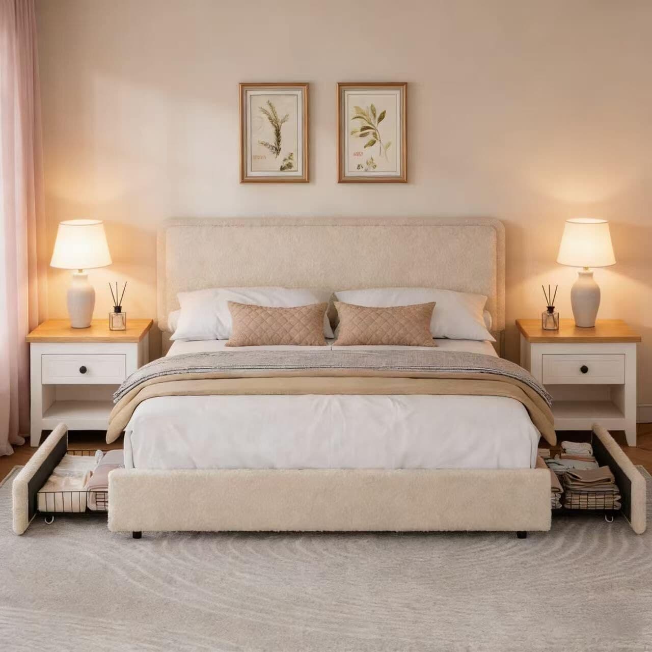 Soft Teddy Fleece Upholstered Platform Bed Frame with 2 Storage Drawer