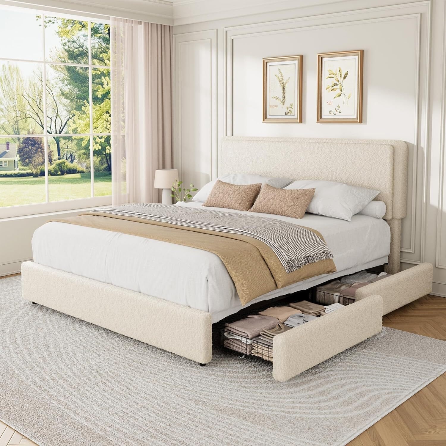 Twin Boucle Bed Frame with Storage Drawers, White Upholstered Platform Bed with Round Headboard, Noise-Free