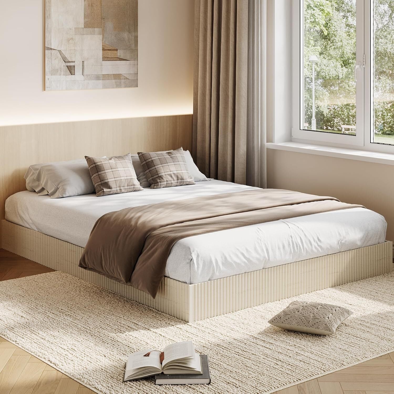 Fluted Design Platform Bed Frame with Study Support, Easy Assembly, Beige
