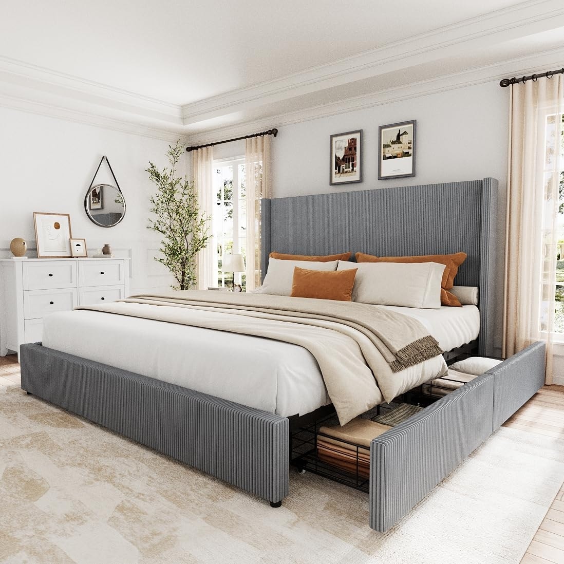 Queen Tufted Upholstered Bed, Storage Drawers, Grey