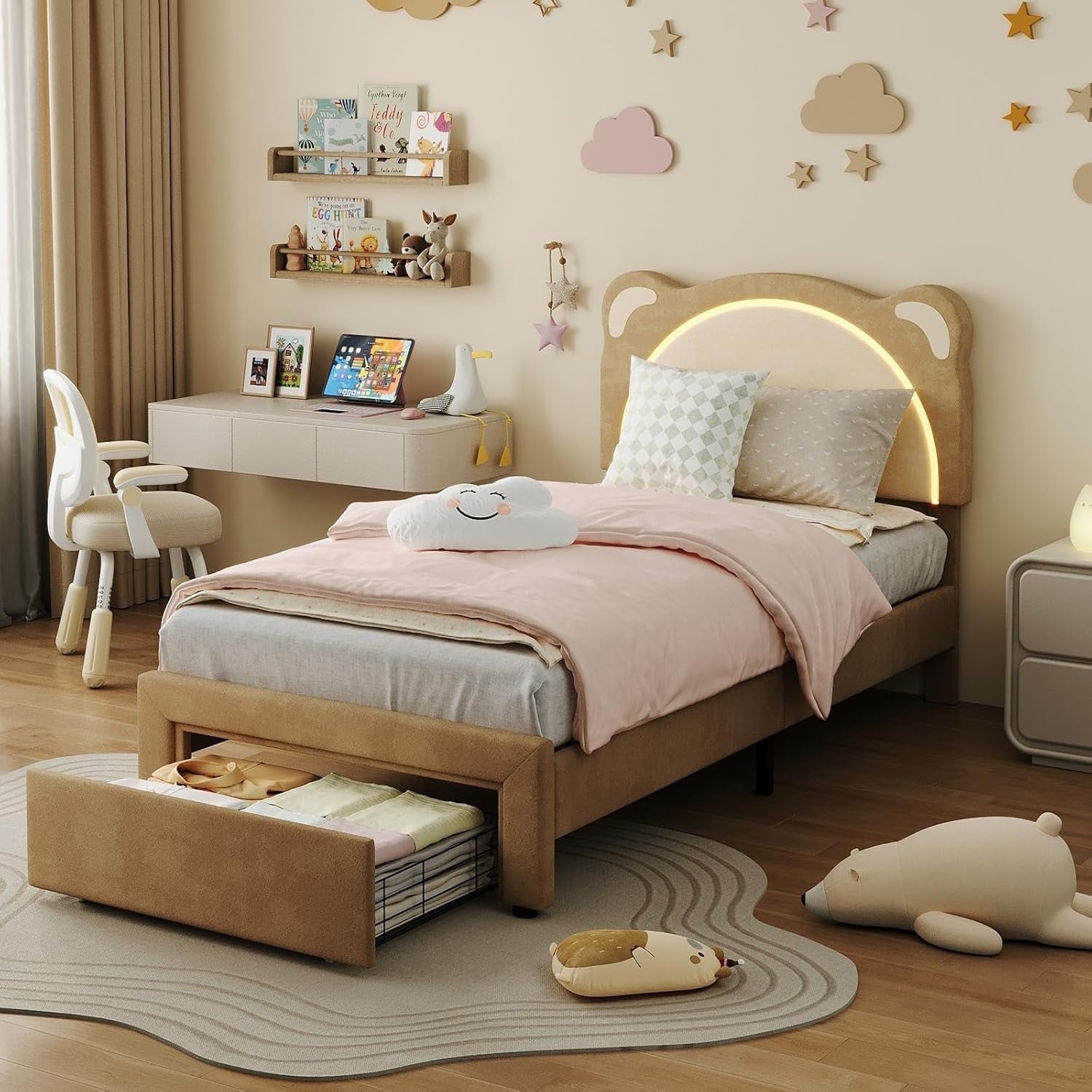 Twin LED Bed, Yellow, Slats+Storage Drawer