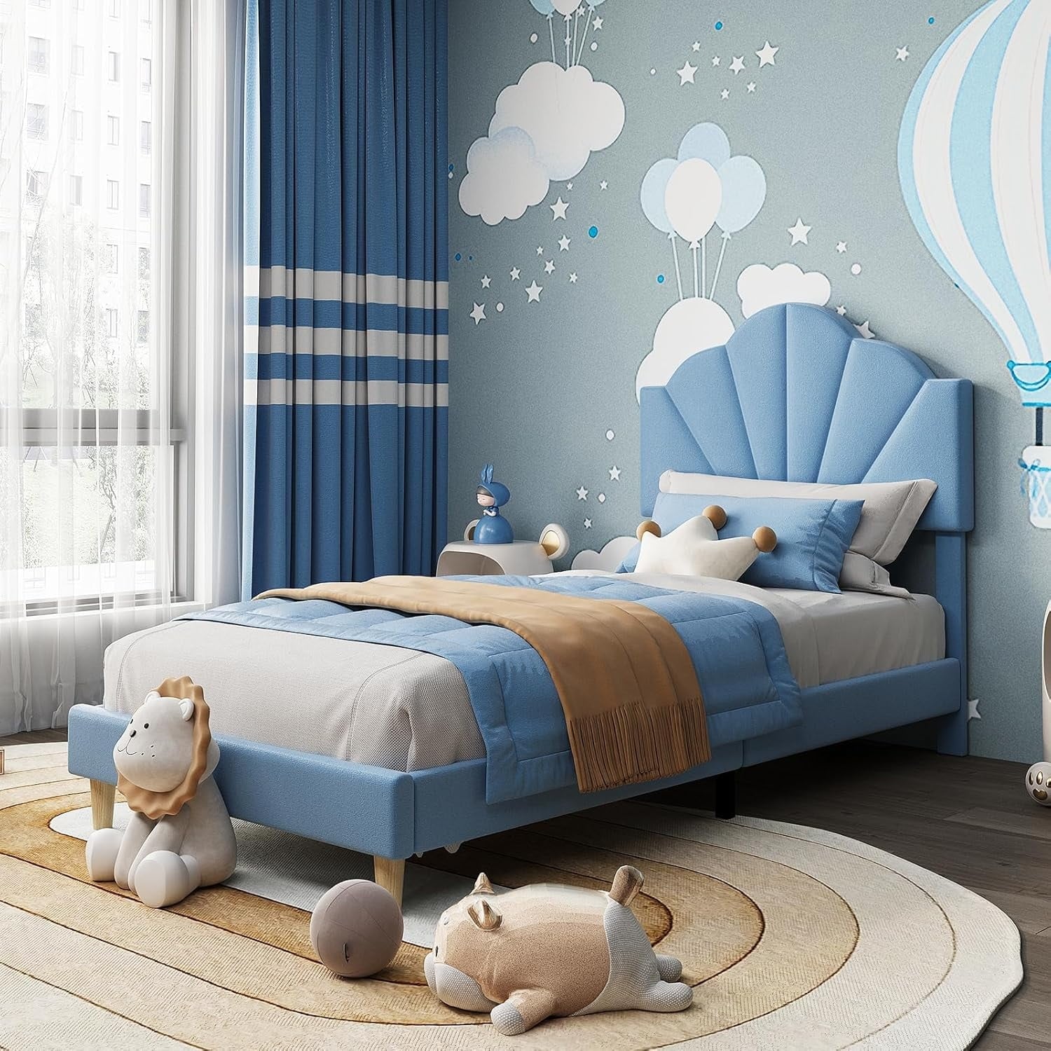 Twin-XL Velvet Bed, Blue, Adjustable Headboard