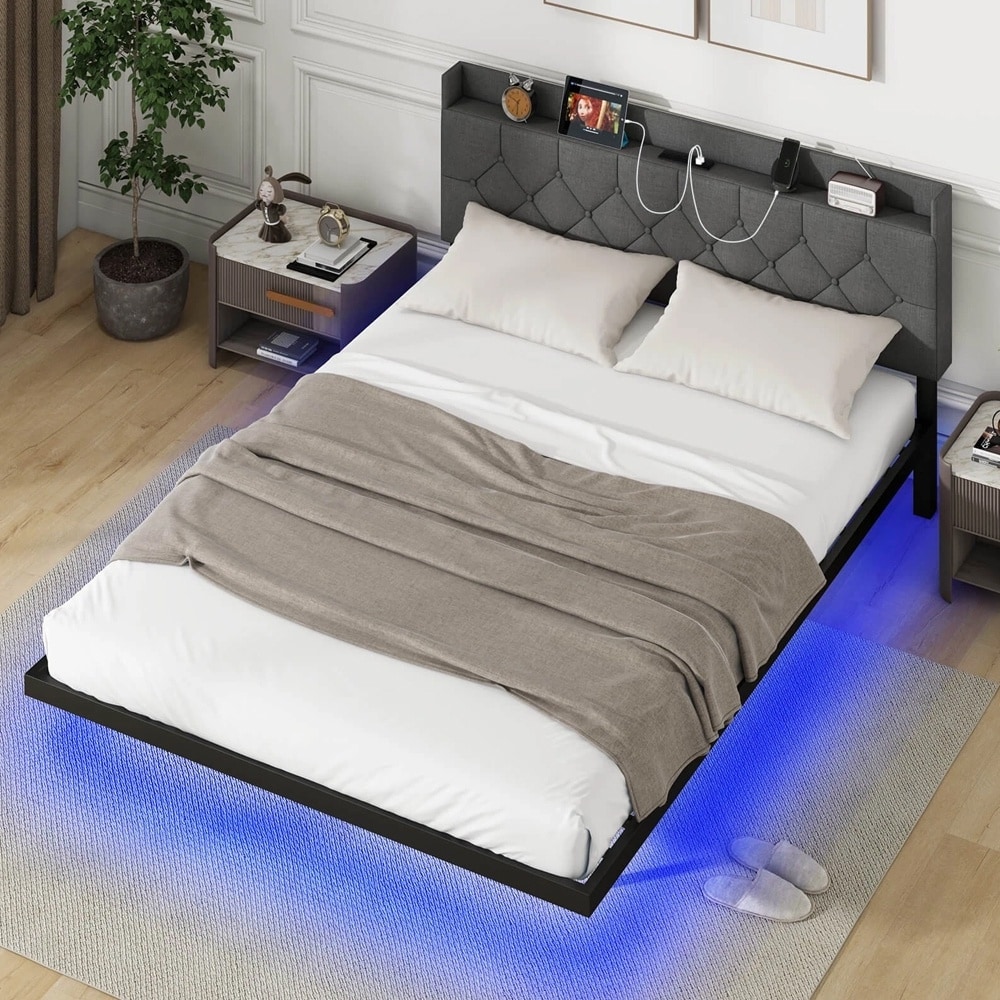 Queen Floating Bed Frame LED Lights Adjustable Upholstered Headboard
