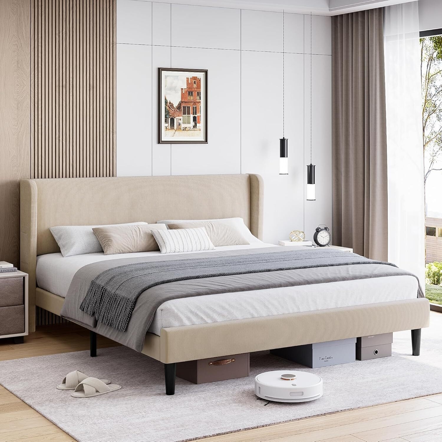 Elegant Velvet Upholstered Bed Frame with Headboad and Wingback, Easy Assembly, Beige