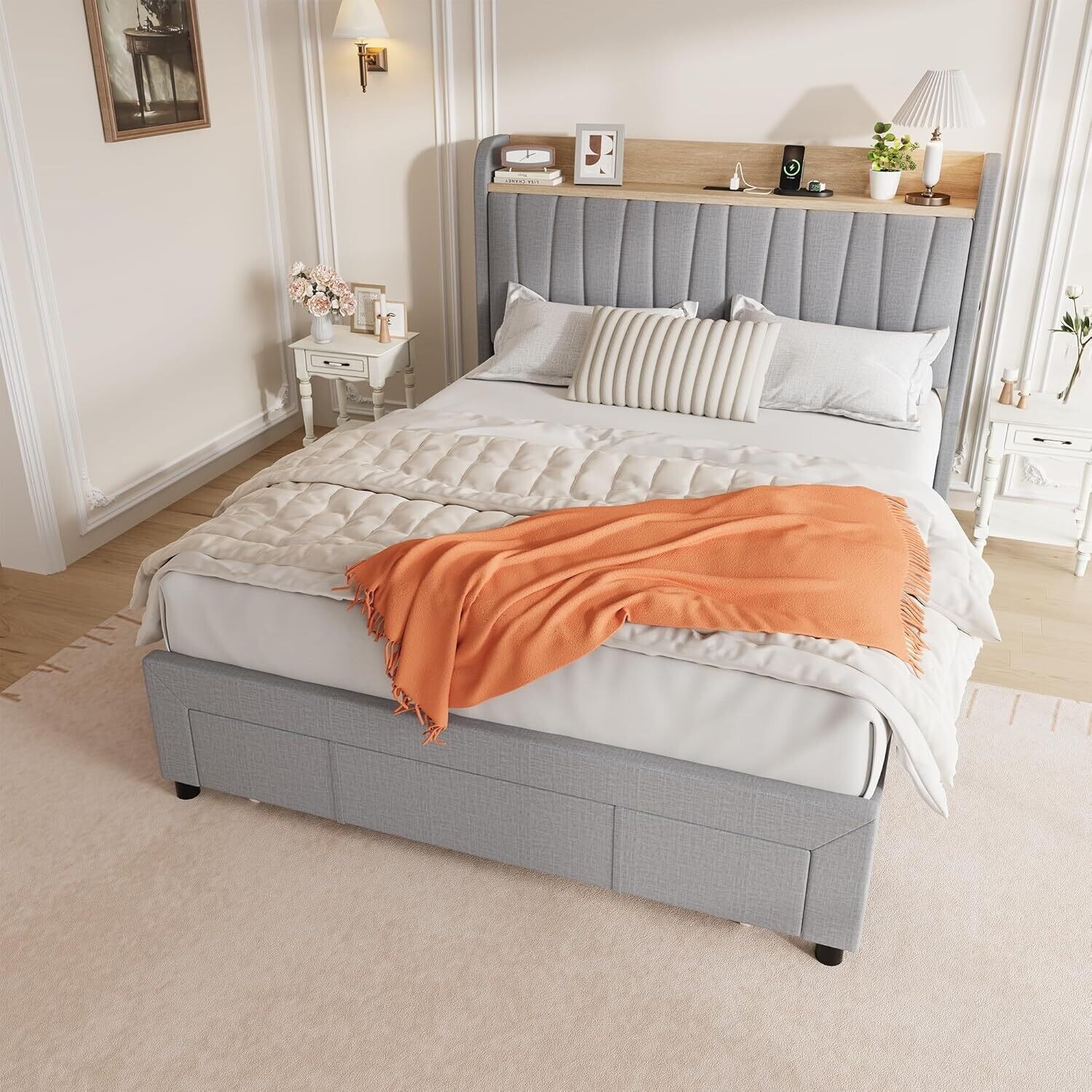 Upholstered Platform Beds with Drawers, Storage Headboard, Charging Station, Grey